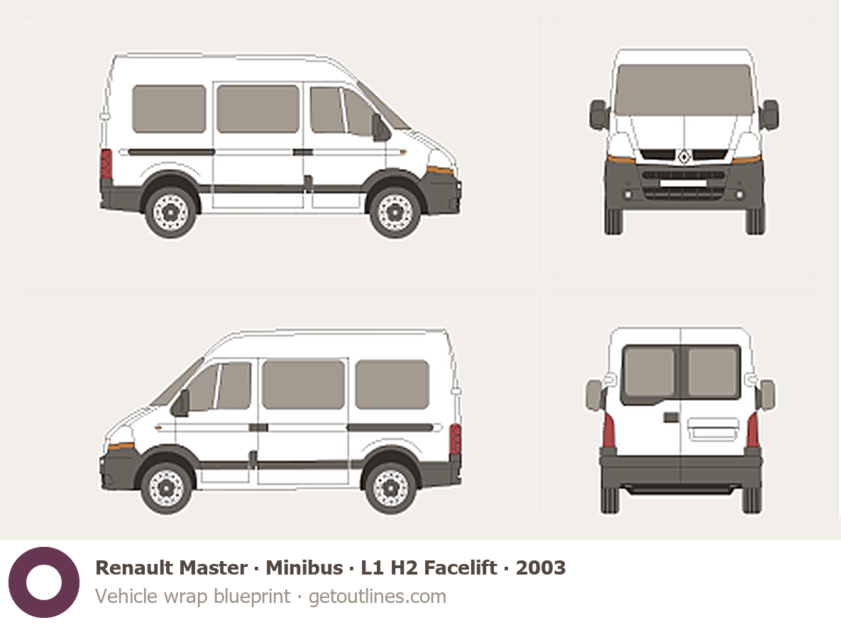 This 2003 Renault Master Minibus L1 H2 Facelift Wagon blueprint helps designers, wrap studios, and 3D artists simplify their workflow and save valuable time for creative work instead of routine tasks.