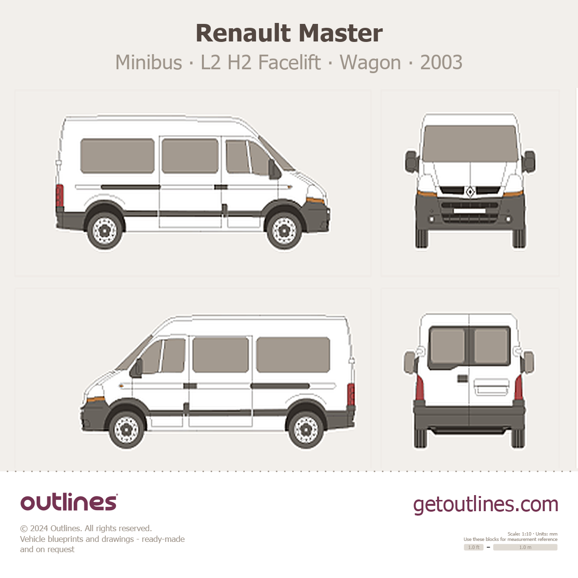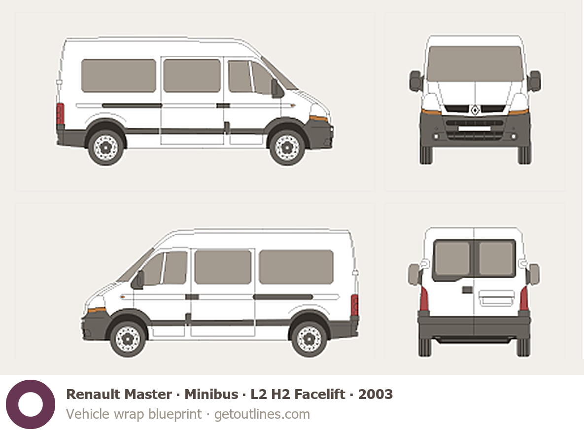 This 2003 Renault Master Minibus L2 H2 Facelift Wagon blueprint helps designers, wrap studios, and 3D artists simplify their workflow and save valuable time for creative work instead of routine tasks.