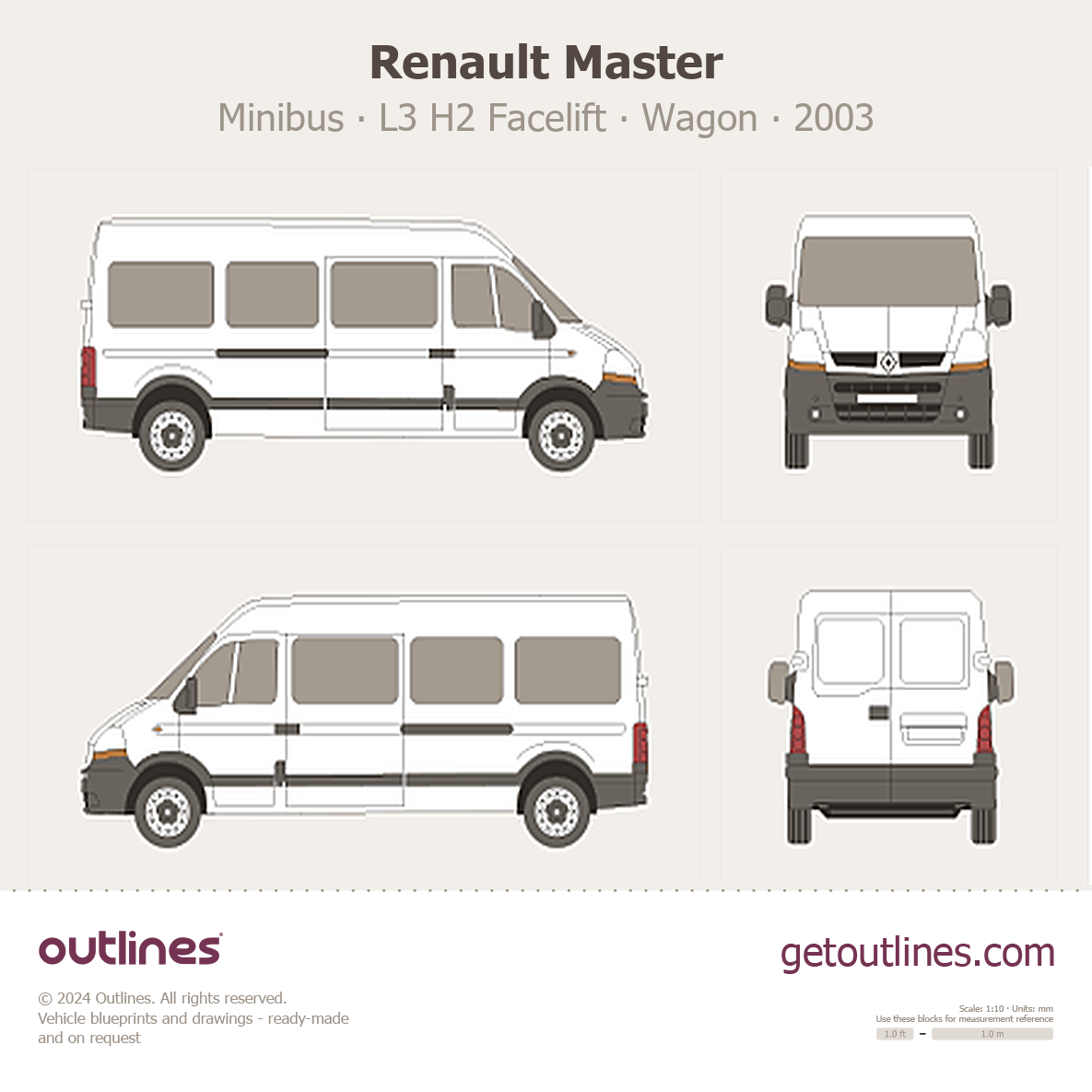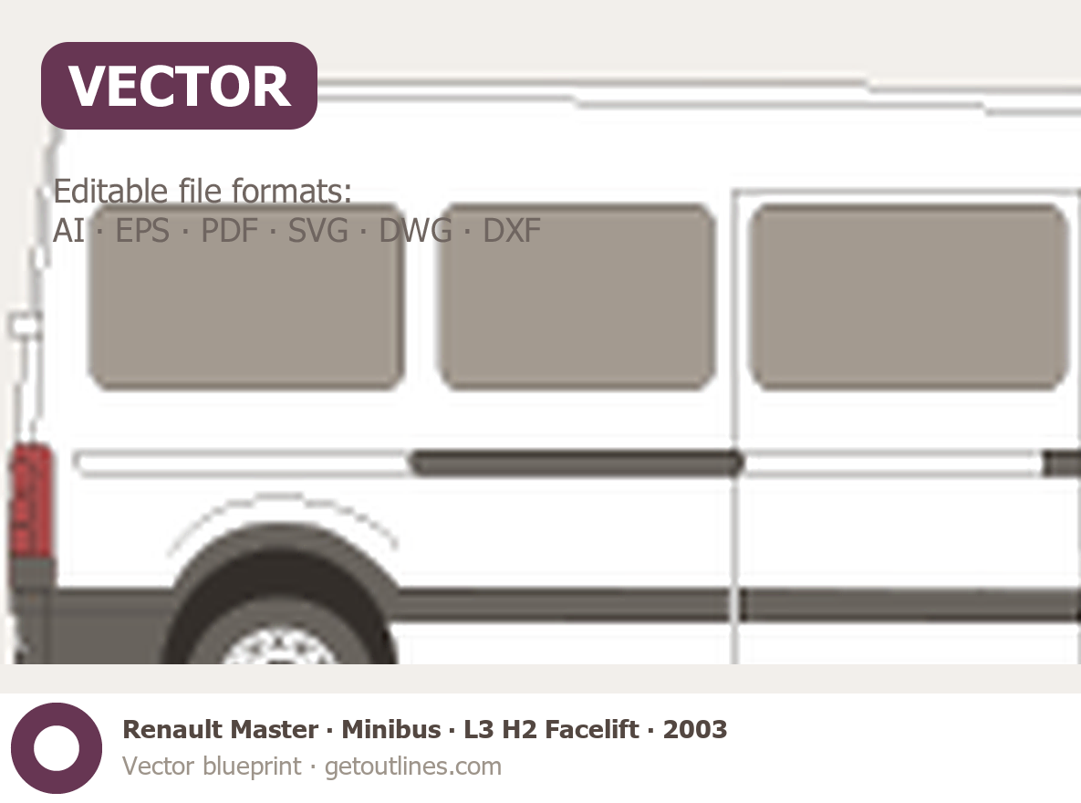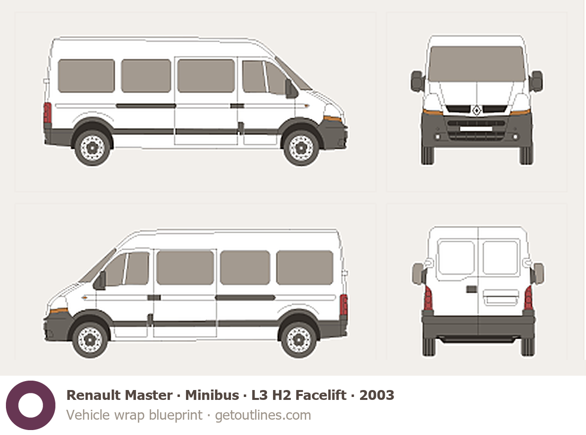 This 2003 Renault Master Minibus L3 H2 Facelift Wagon blueprint helps designers, wrap studios, and 3D artists simplify their workflow and save valuable time for creative work instead of routine tasks.