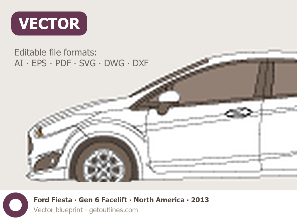 This 2013 Ford Fiesta Gen 6 Facelift North America Sedan blueprint helps designers, wrap studios, and 3D artists simplify their workflow and save valuable time for creative work instead of routine tasks.