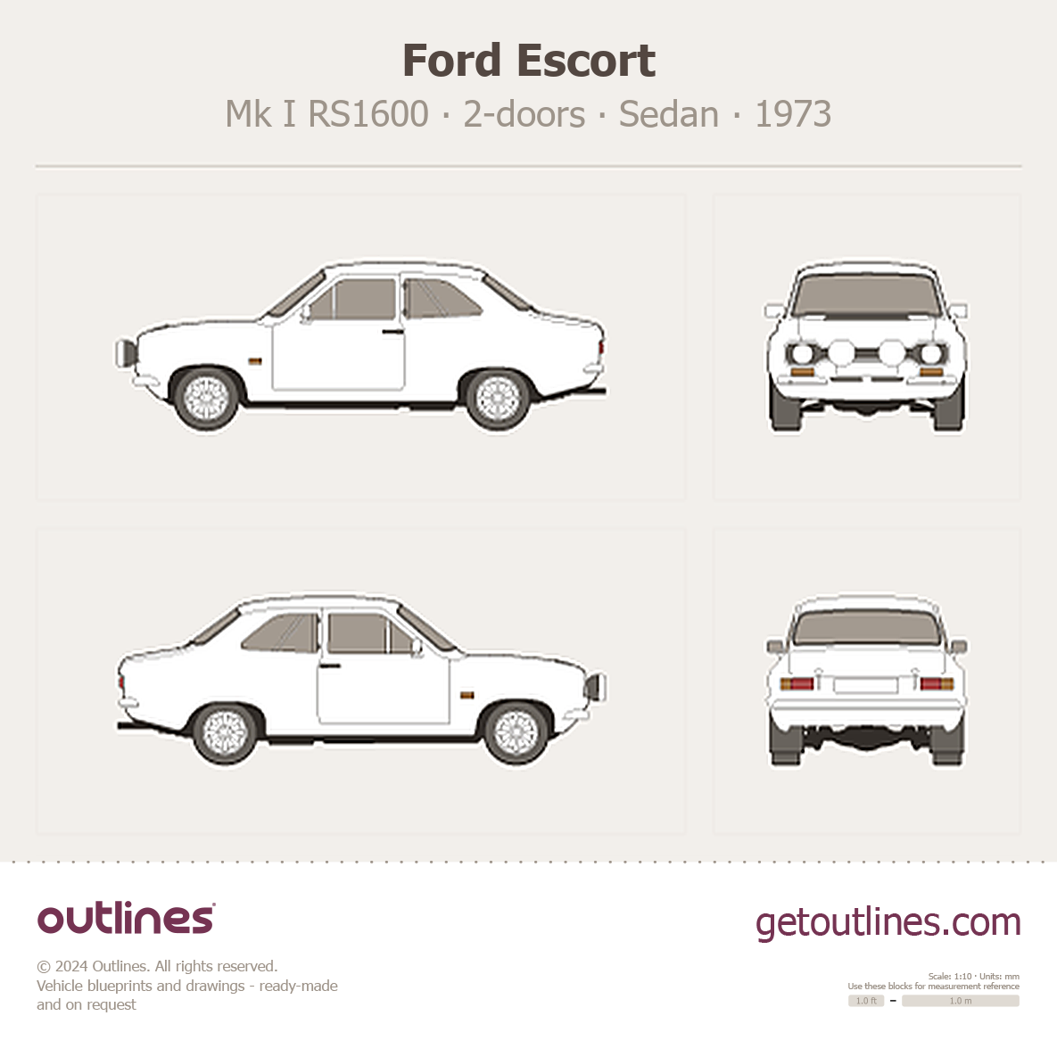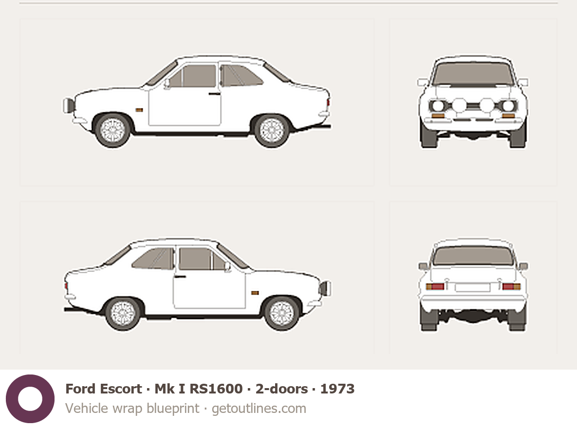 Buy this Ford Escort Mk I RS1600 blueprint and line drawing in high-quality editable vector file formats. Best for 3D and car wrap design.