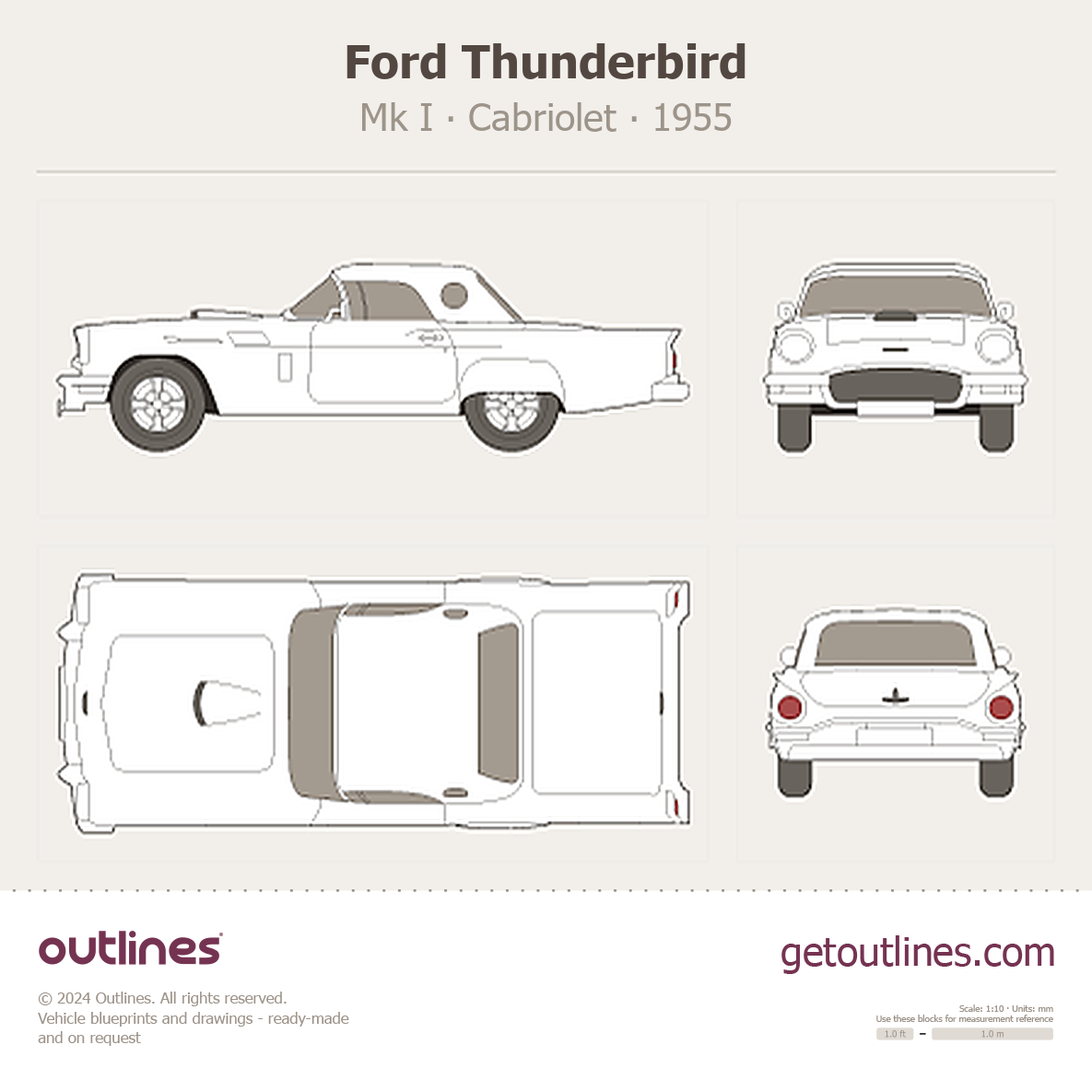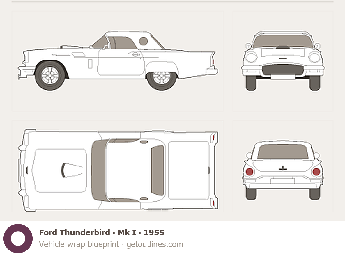 Buy this Ford Thunderbird Mk I blueprint and line drawing in high-quality editable vector file formats. Best for 3D and car wrap design.