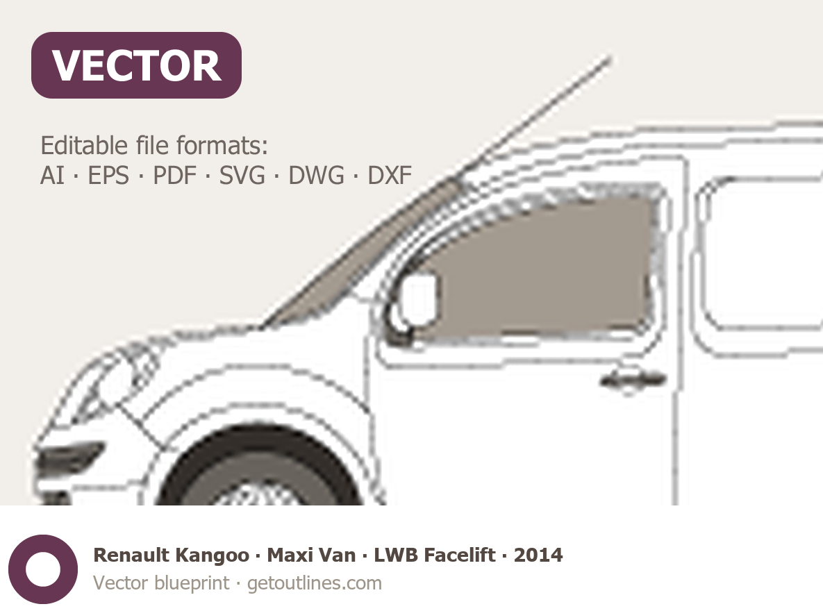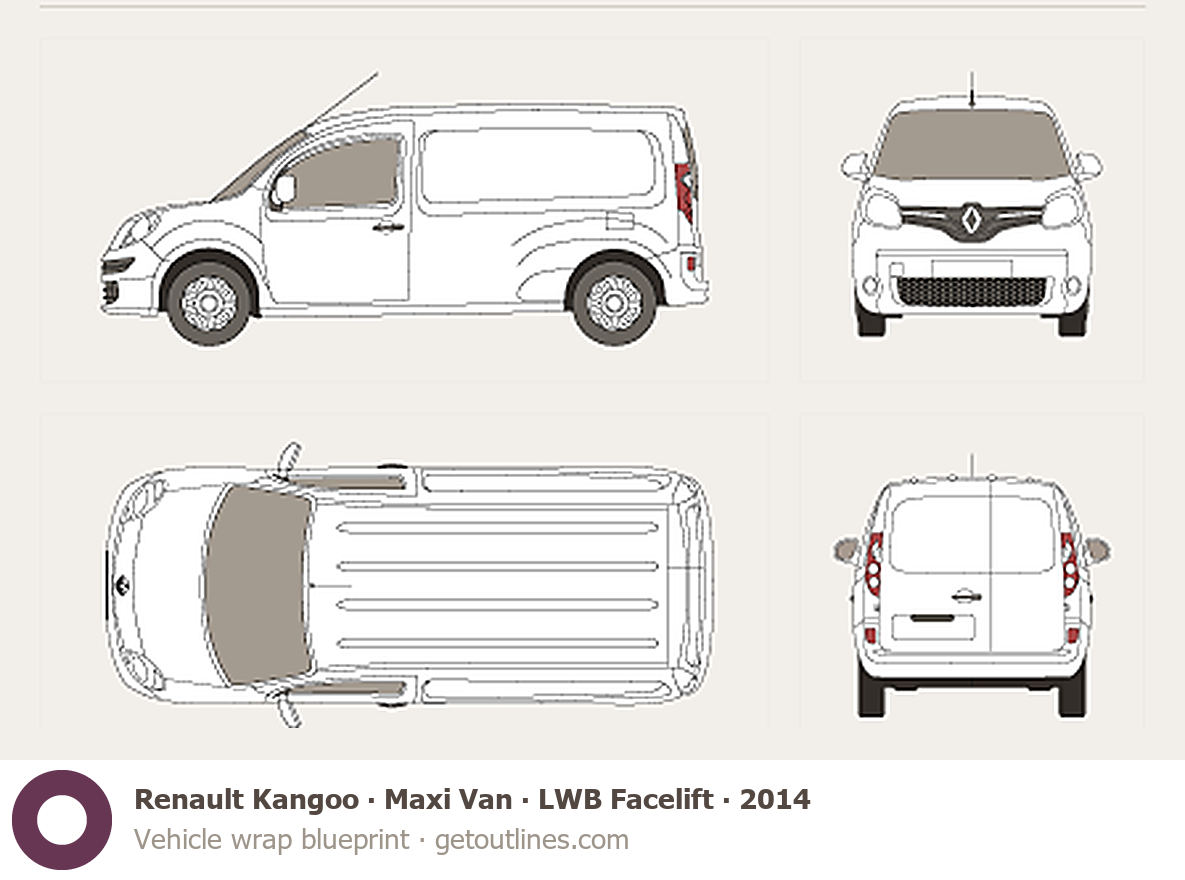 This 2014 Renault Kangoo Maxi Van LWB Facelift Van blueprint helps designers, wrap studios, and 3D artists simplify their workflow and save valuable time for creative work instead of routine tasks.