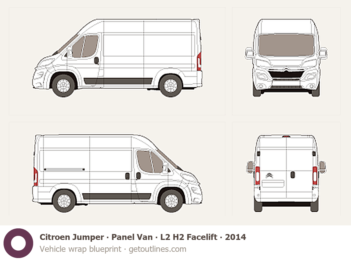 This 2014 Citroen Jumper Panel Van L2 H2 Facelift Van blueprint helps designers, wrap studios, and 3D artists simplify their workflow and save valuable time for creative work instead of routine tasks.