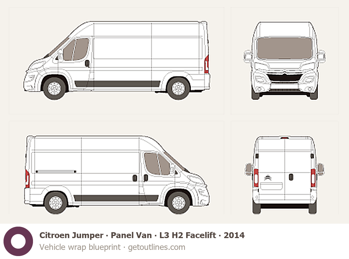 This 2014 Citroen Jumper Panel Van L3 H2 Facelift Van blueprint helps designers, wrap studios, and 3D artists simplify their workflow and save valuable time for creative work instead of routine tasks.