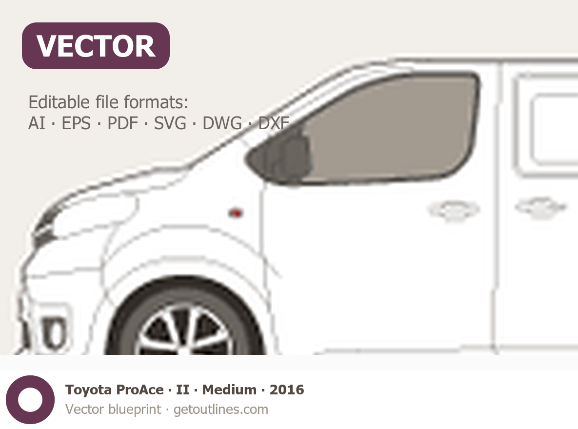 This 2016 Toyota ProAce II Medium Van blueprint helps designers, wrap studios, and 3D artists simplify their workflow and save valuable time for creative work instead of routine tasks.