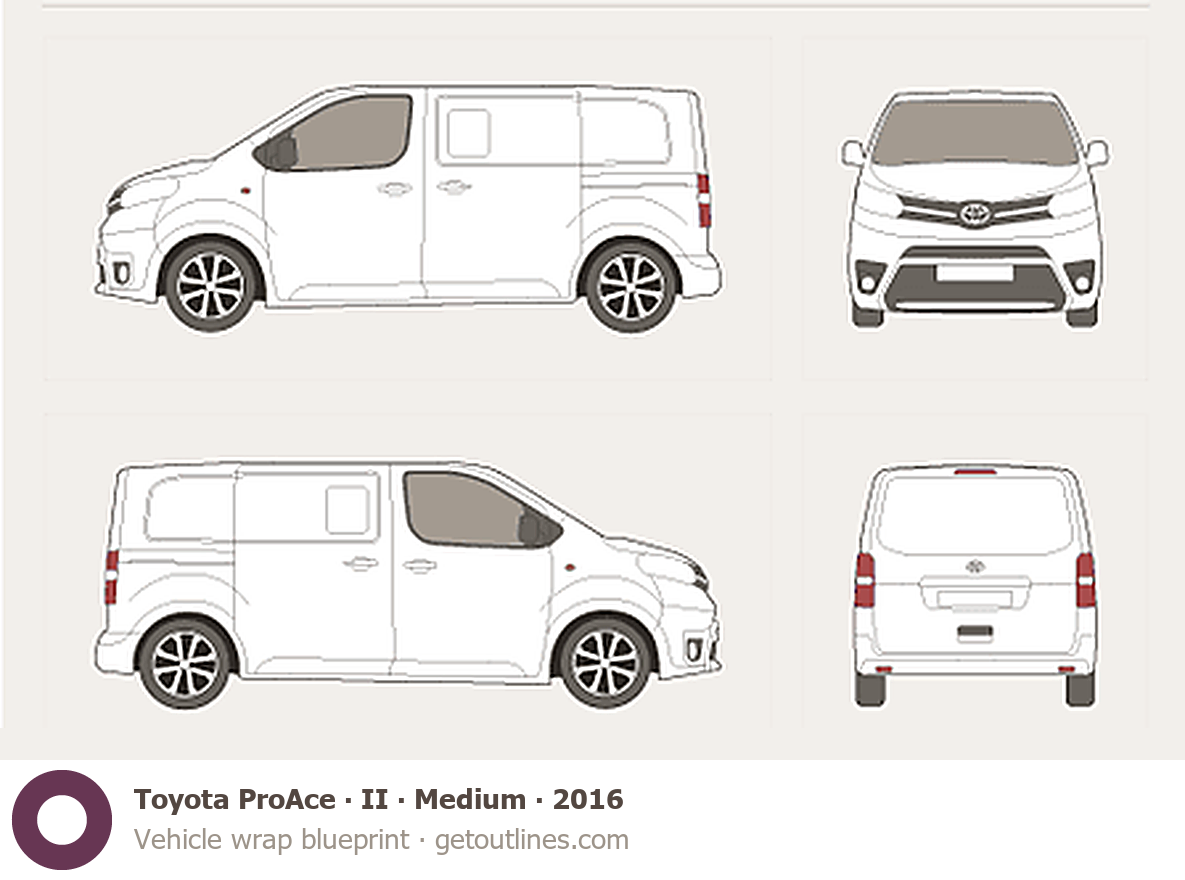 This template is suitable for Toyota ProAce models from 2016, including 2016, 2017, 2018, 2019, and 2026 model years, and is commonly used for vehicle wrap and signage design.