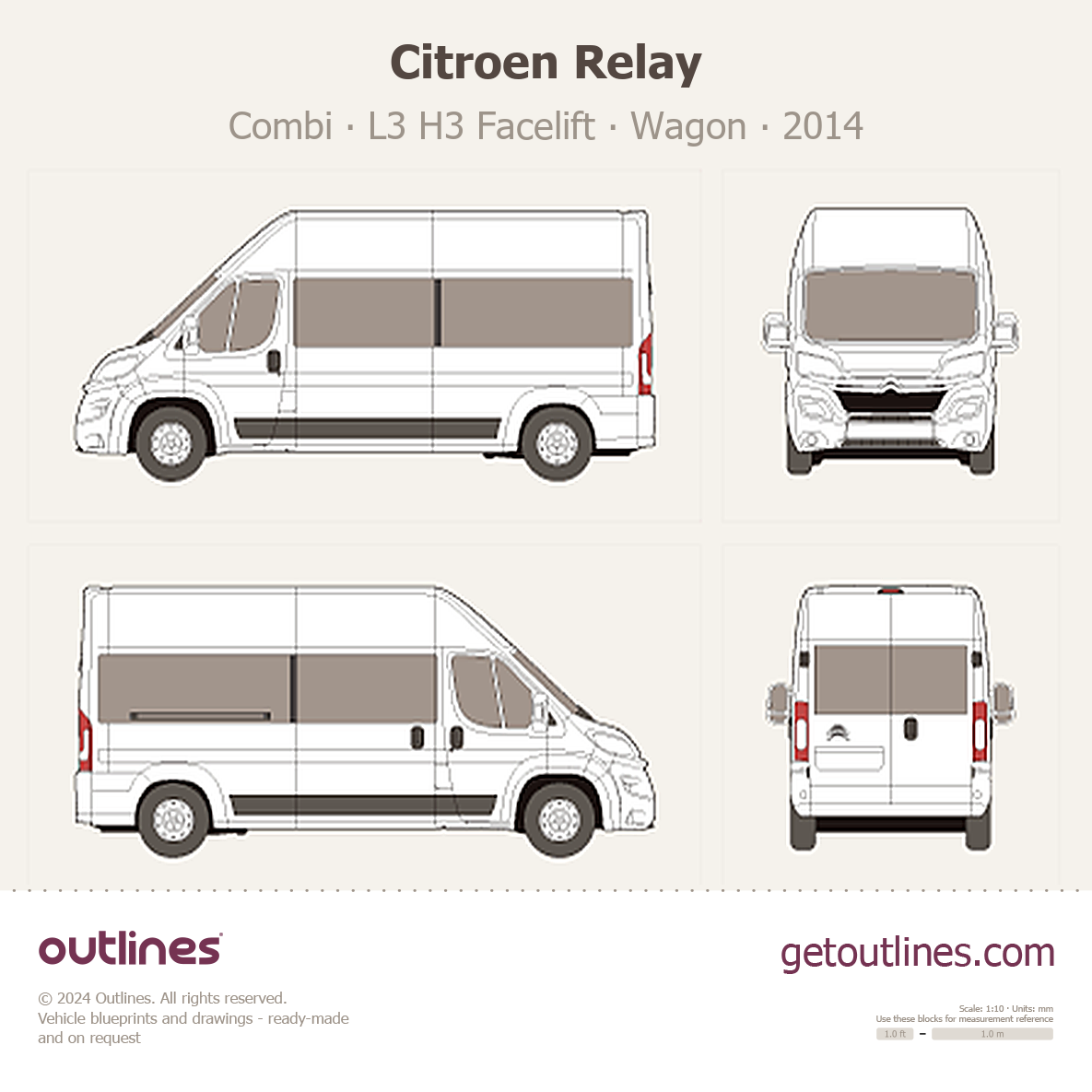 This is a blueprint of the Relay, produced by carmaker Citroen in 2014 - Present (2025, 2026). It features a Wagon body design and is classified as a Commercial vehicle.