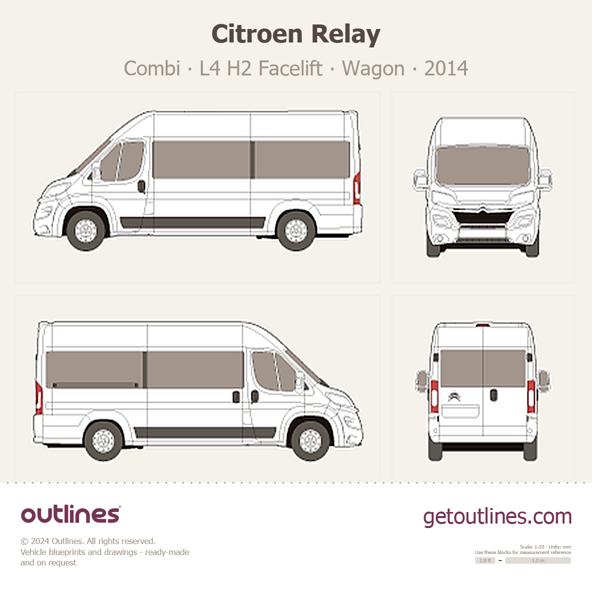 This is a blueprint of the Relay, produced by carmaker Citroen in 2014 - Present (2025, 2026). It features a Wagon body design and is classified as a Commercial vehicle.