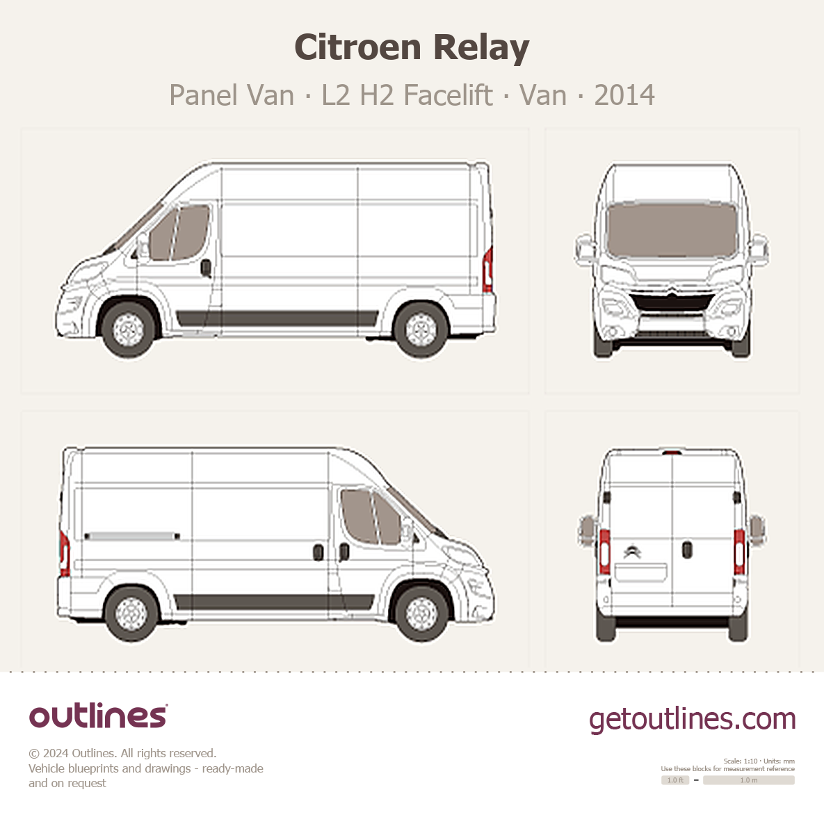 This is a blueprint of the Relay, produced by carmaker Citroen in 2014 - Present (2025, 2026). It features a Van body design and is classified as a Commercial vehicle.