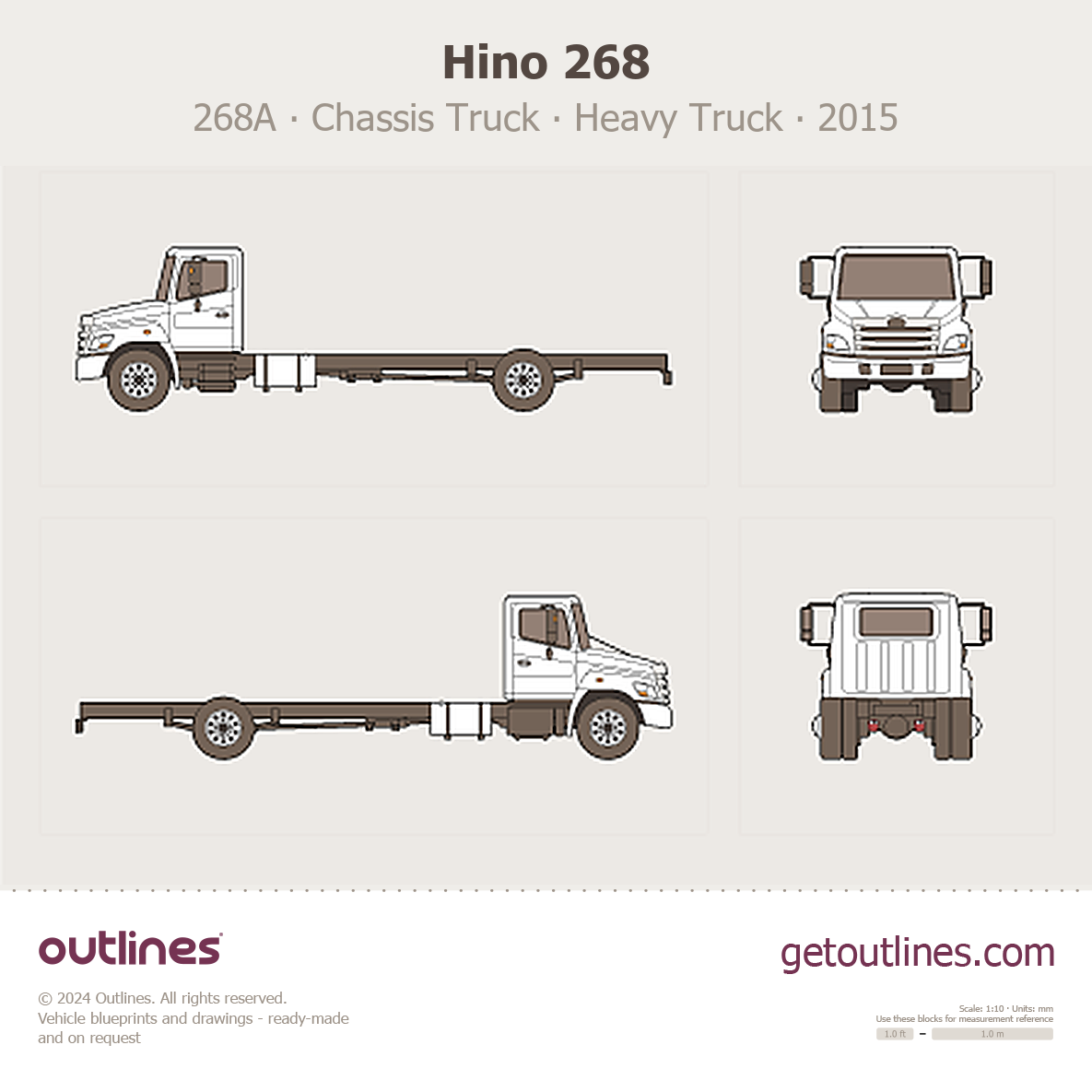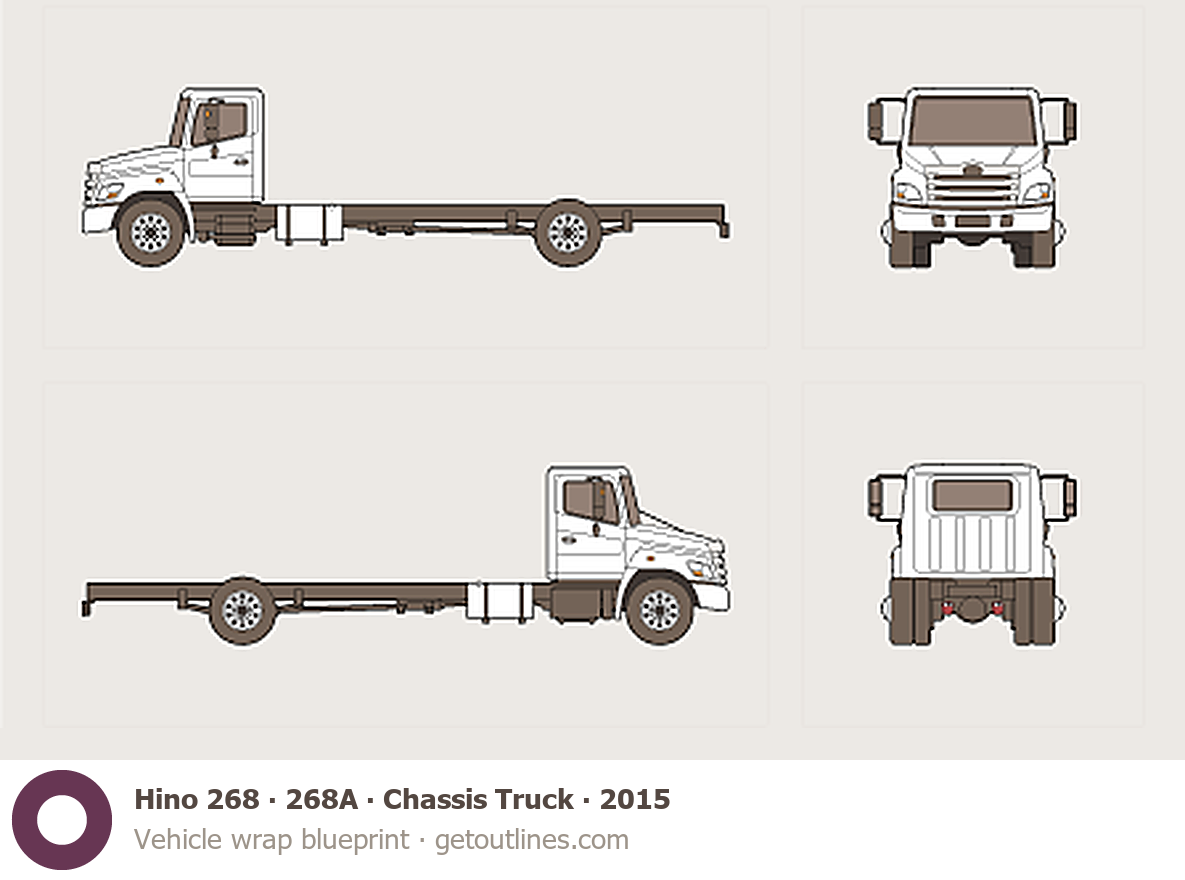 This 2015 Hino 268 268A ∙ Chassis Truck Heavy Truck blueprint helps designers, wrap studios, and 3D artists simplify their workflow and save valuable time for creative work instead of routine tasks.