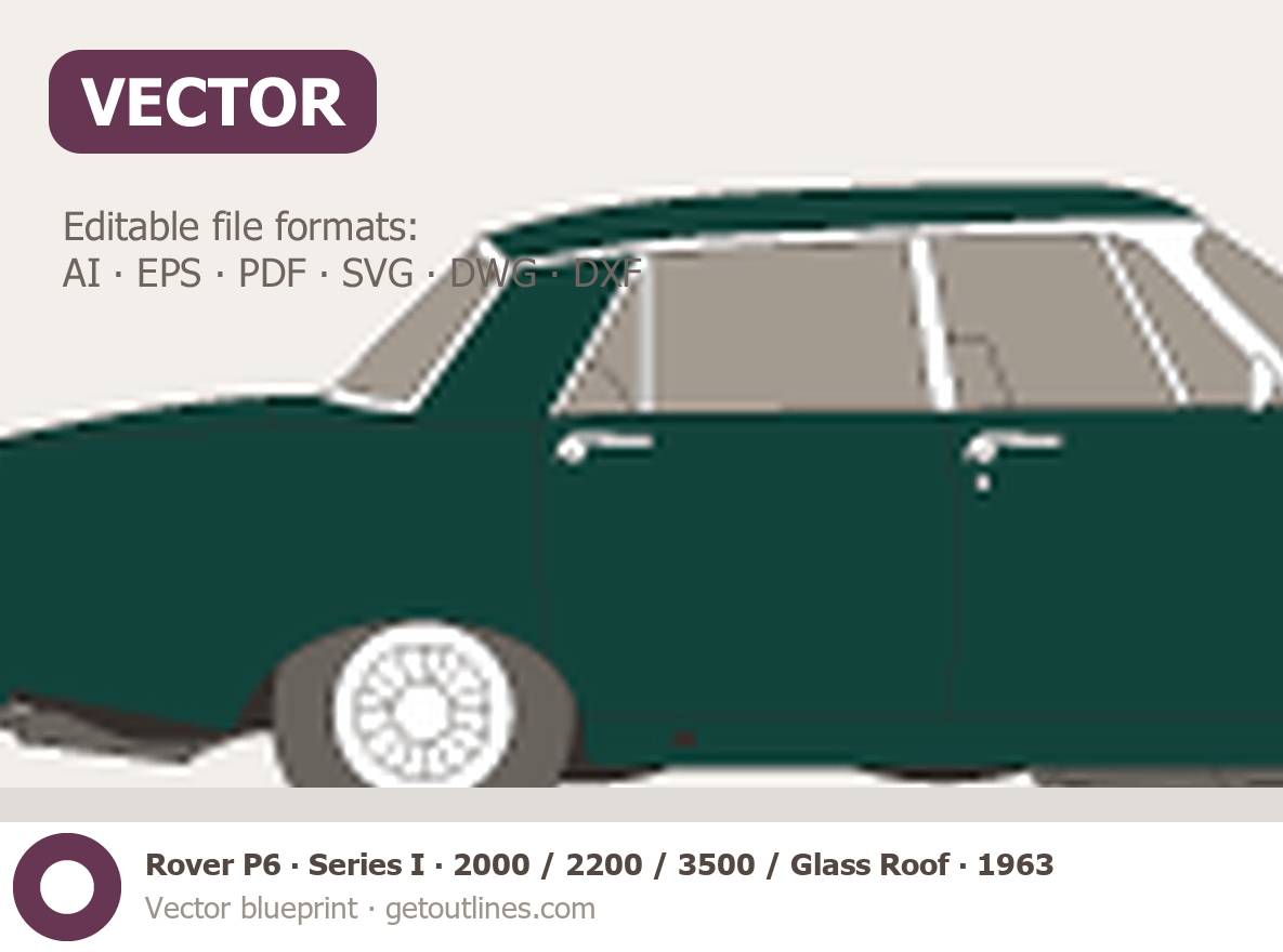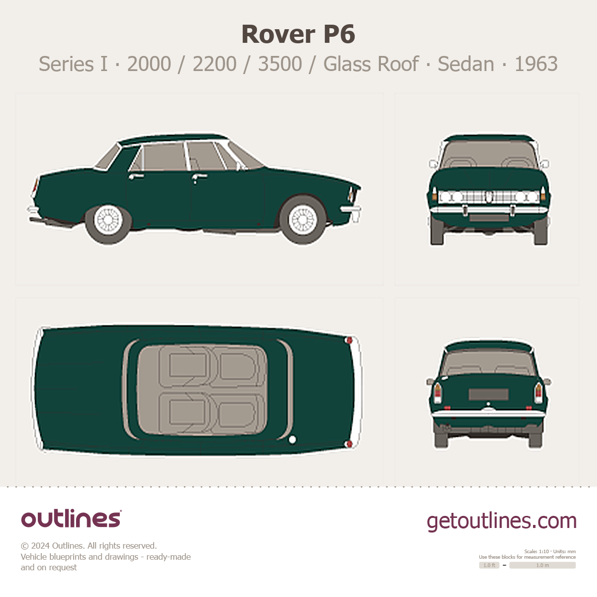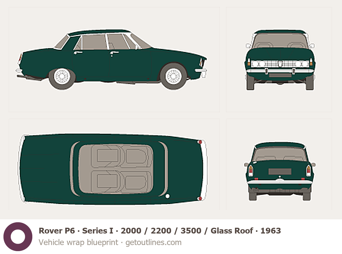This 1963 Rover P6 Series I 2000 / 2200 / 3500 / Glass Roof Sedan blueprint helps designers, wrap studios, and 3D artists simplify their workflow and save valuable time for creative work instead of routine tasks.