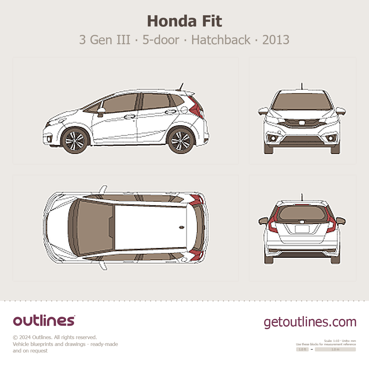 This 2013 Honda Fit 3 Gen III 5-door Hatchback blueprint helps designers, wrap studios, and 3D artists simplify their workflow and save valuable time for creative work instead of routine tasks.