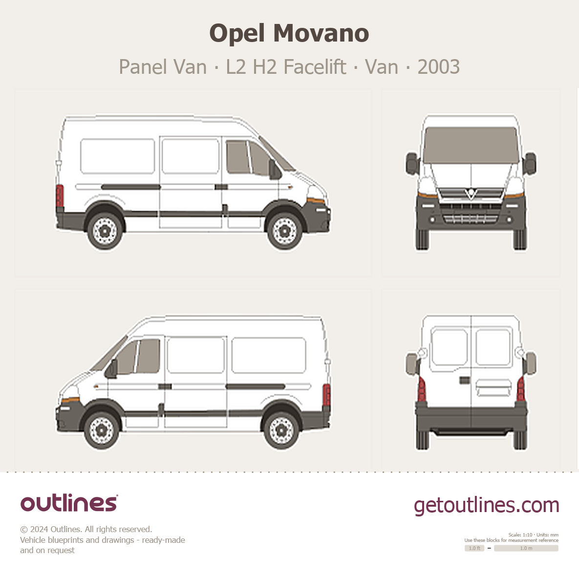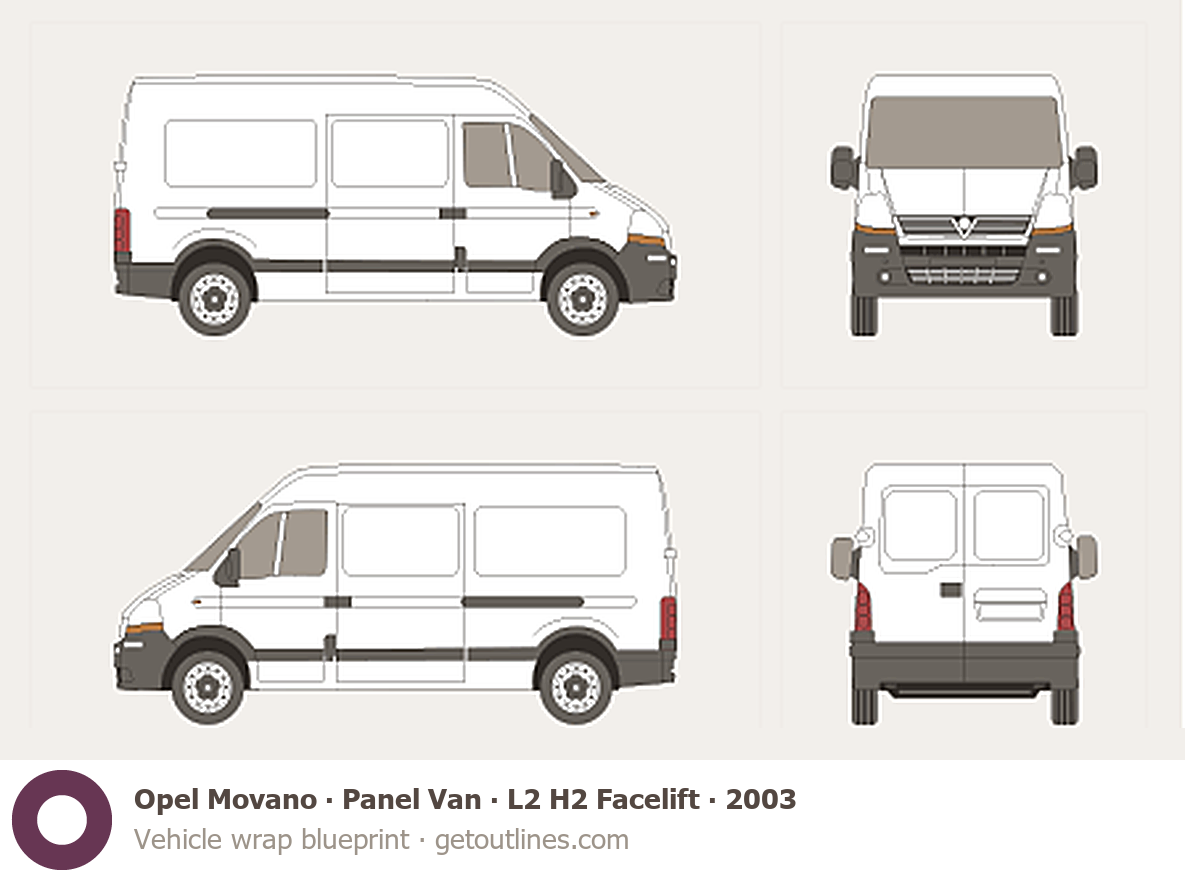 This 2003 Opel Movano Panel Van L2 H2 Facelift Van blueprint helps designers, wrap studios, and 3D artists simplify their workflow and save valuable time for creative work instead of routine tasks.