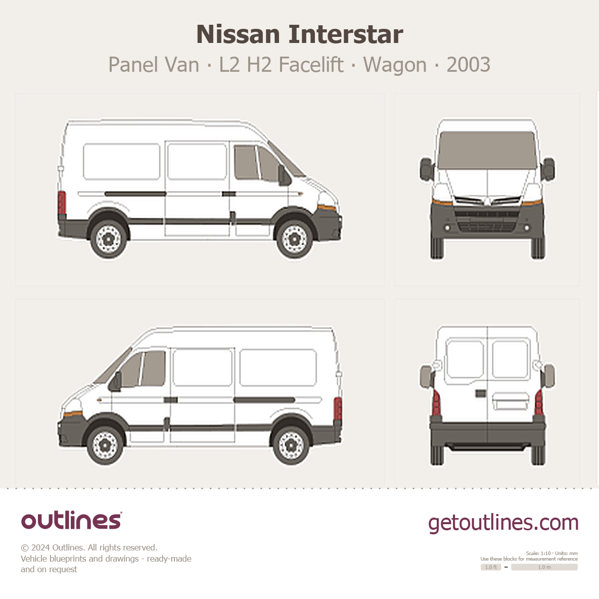This 2003 Nissan Interstar Panel Van L2 H2 Facelift Wagon blueprint helps designers, wrap studios, and 3D artists simplify their workflow and save valuable time for creative work instead of routine tasks.