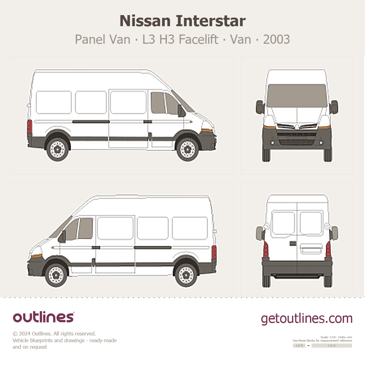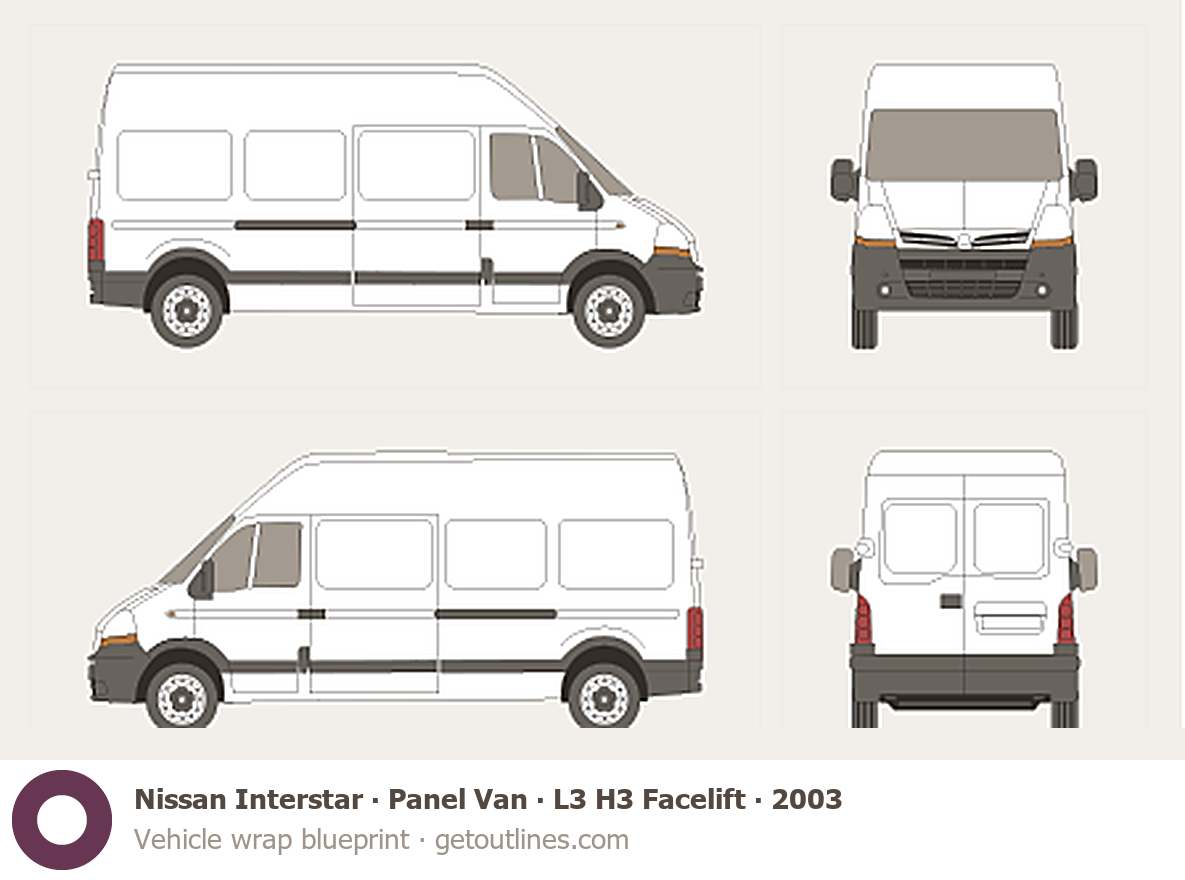 This template is suitable for Nissan Interstar models from 2003 to 2010, including 2003, 2004, 2005, 2006, and 2010 model years, and is commonly used for vehicle wrap and signage design.