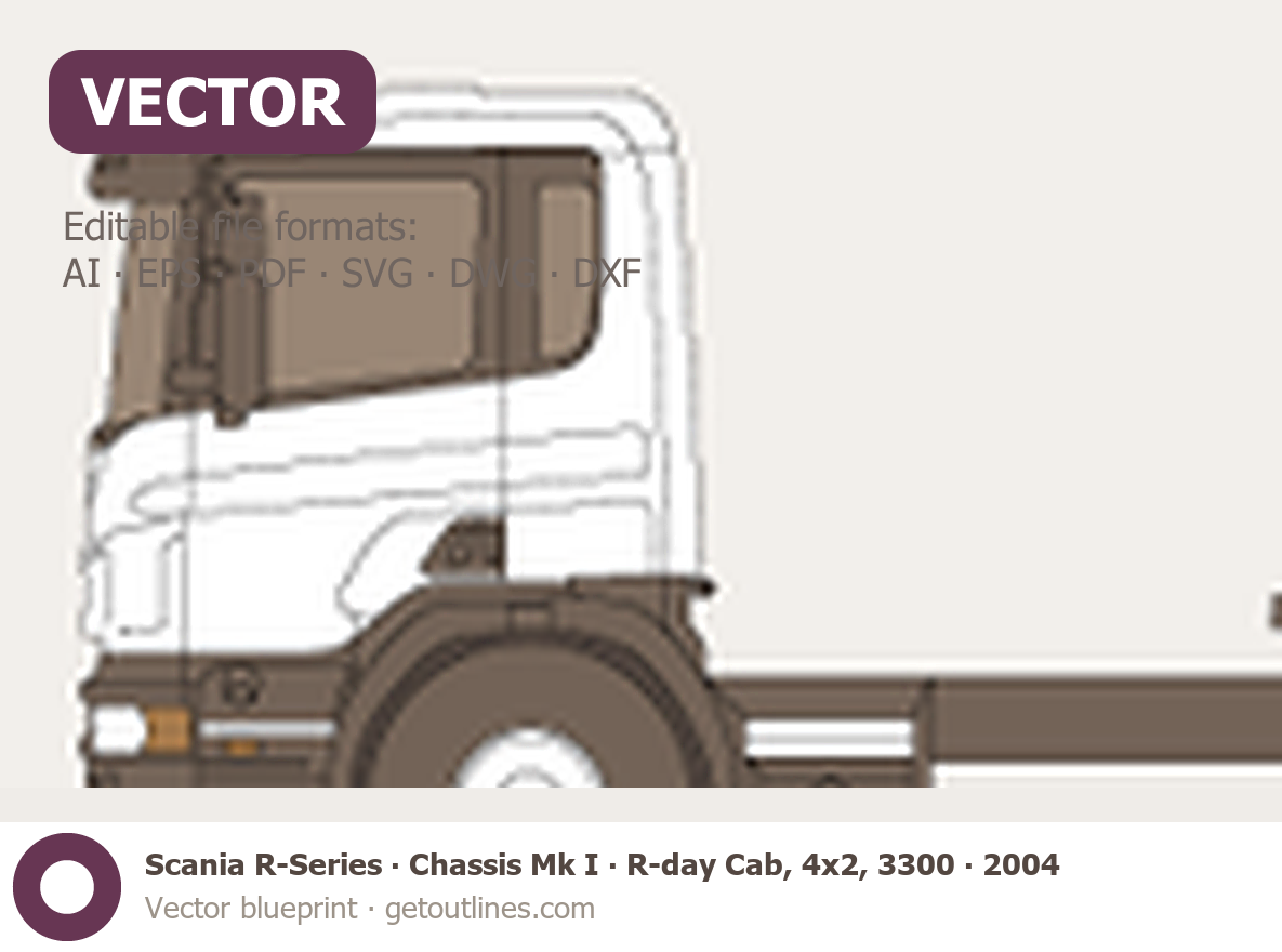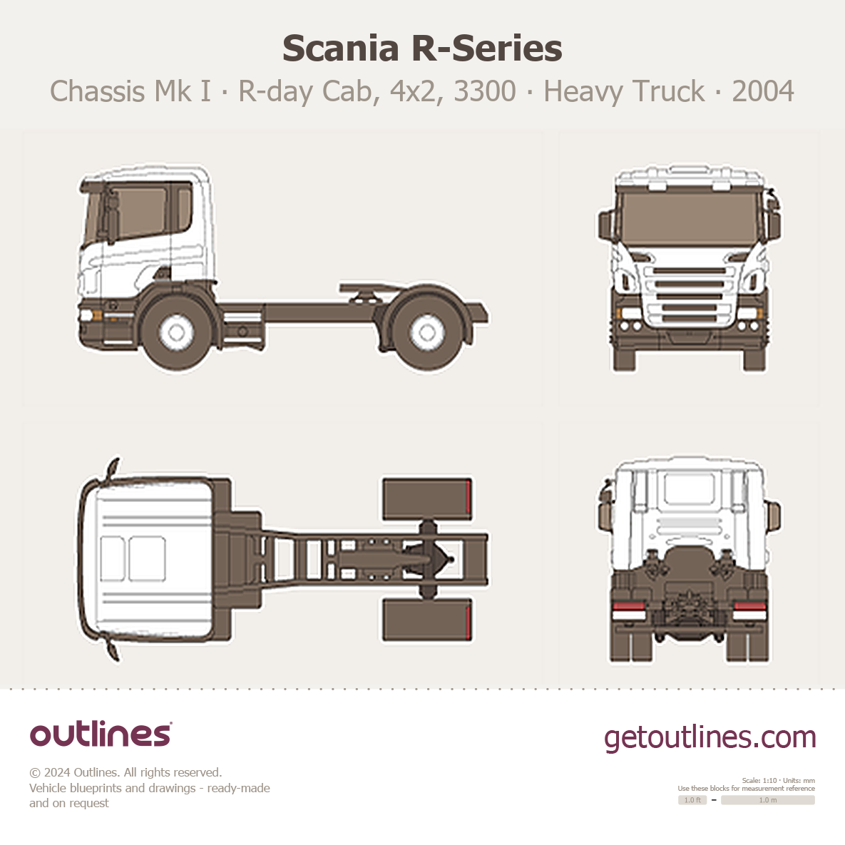 This 2004 Scania R-Series Chassis Mk I R-day Cab, 4x2, 3300 Heavy Truck blueprint helps designers, wrap studios, and 3D artists simplify their workflow and save valuable time for creative work instead of routine tasks.