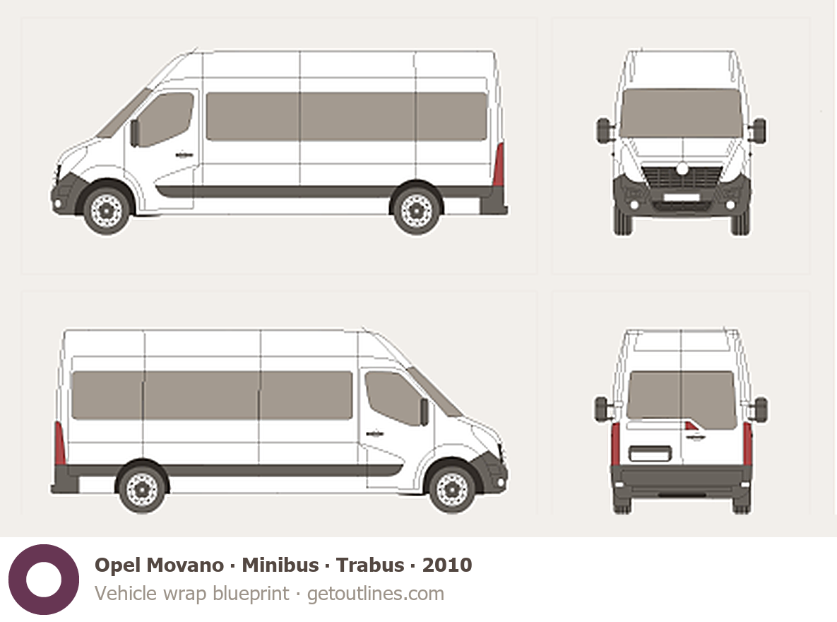 This 2010 Opel Movano Minibus Trabus Bus blueprint helps designers, wrap studios, and 3D artists simplify their workflow and save valuable time for creative work instead of routine tasks.