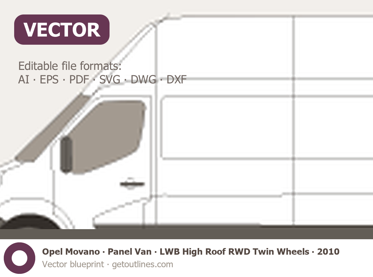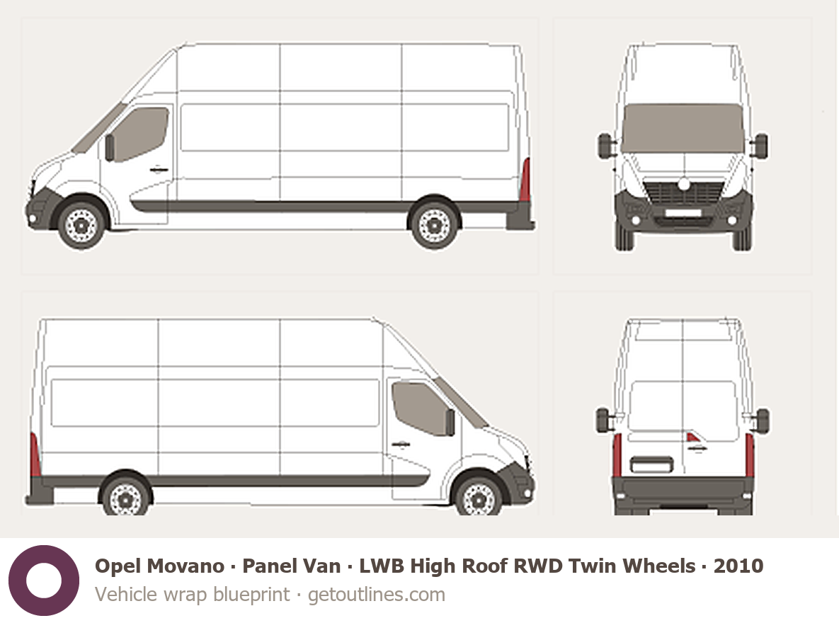 This 2010 Opel Movano Panel Van LWB High Roof RWD Twin Wheels Van blueprint helps designers, wrap studios, and 3D artists simplify their workflow and save valuable time for creative work instead of routine tasks.