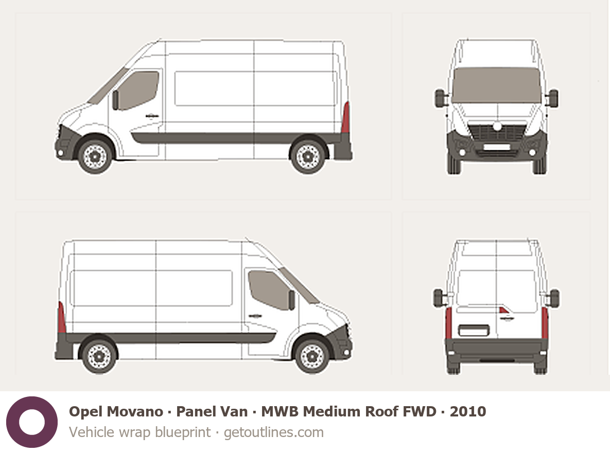 This 2010 Opel Movano Panel Van MWB Medium Roof FWD Van blueprint helps designers, wrap studios, and 3D artists simplify their workflow and save valuable time for creative work instead of routine tasks.