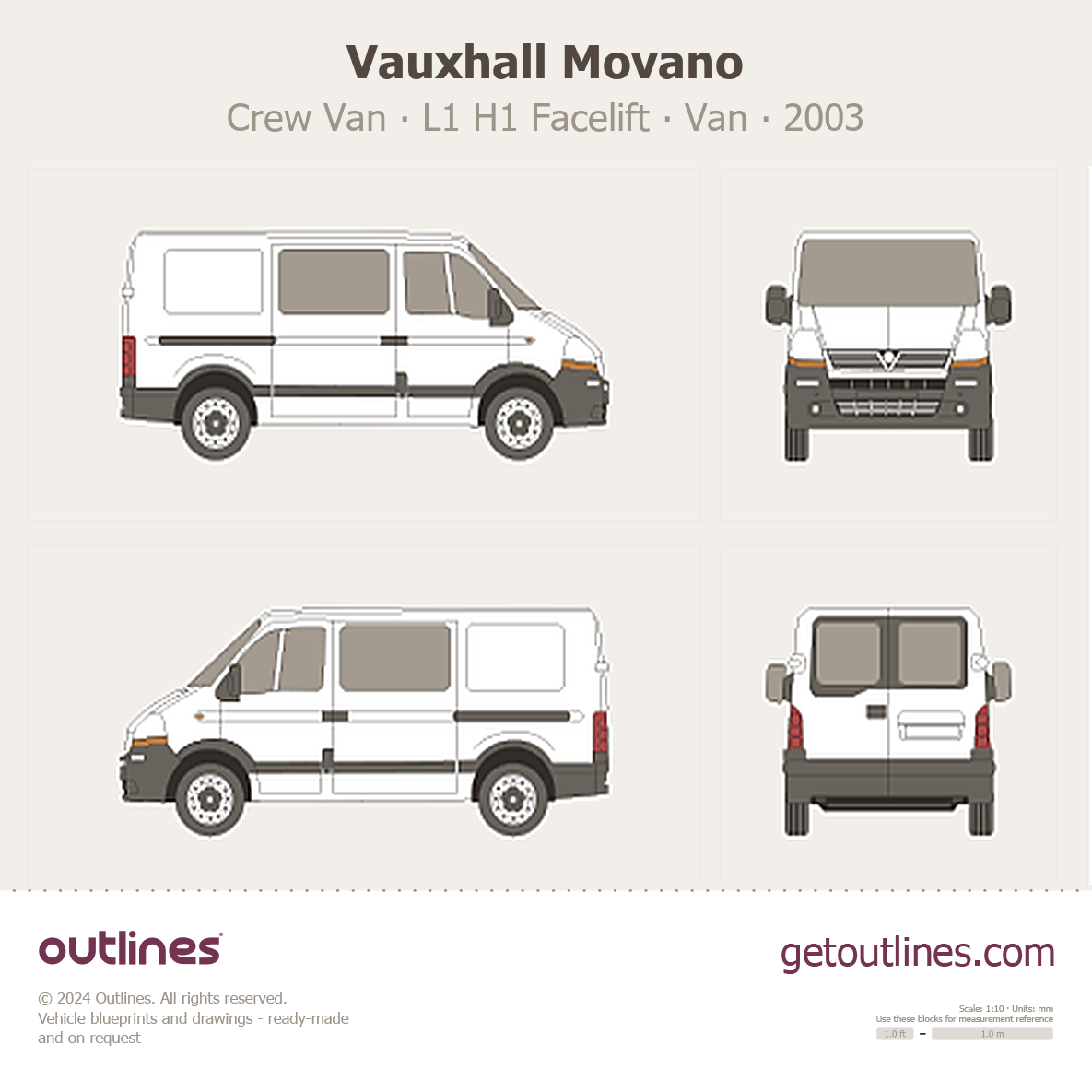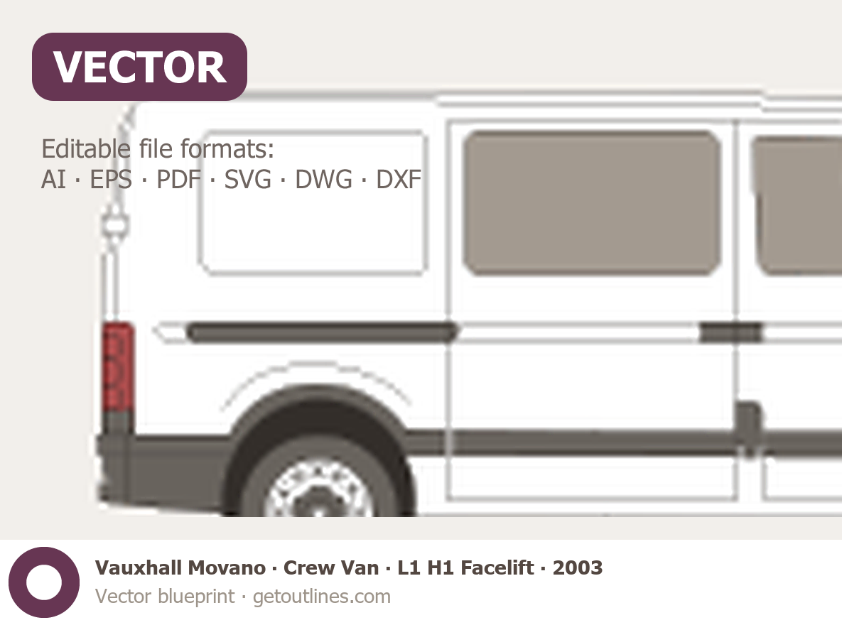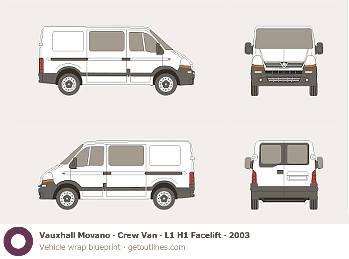 This 2003 Vauxhall Movano Crew Van L1 H1 Facelift Van blueprint helps designers, wrap studios, and 3D artists simplify their workflow and save valuable time for creative work instead of routine tasks.