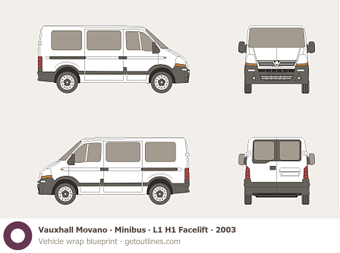 This 2003 Vauxhall Movano Minibus L1 H1 Facelift Wagon blueprint helps designers, wrap studios, and 3D artists simplify their workflow and save valuable time for creative work instead of routine tasks.
