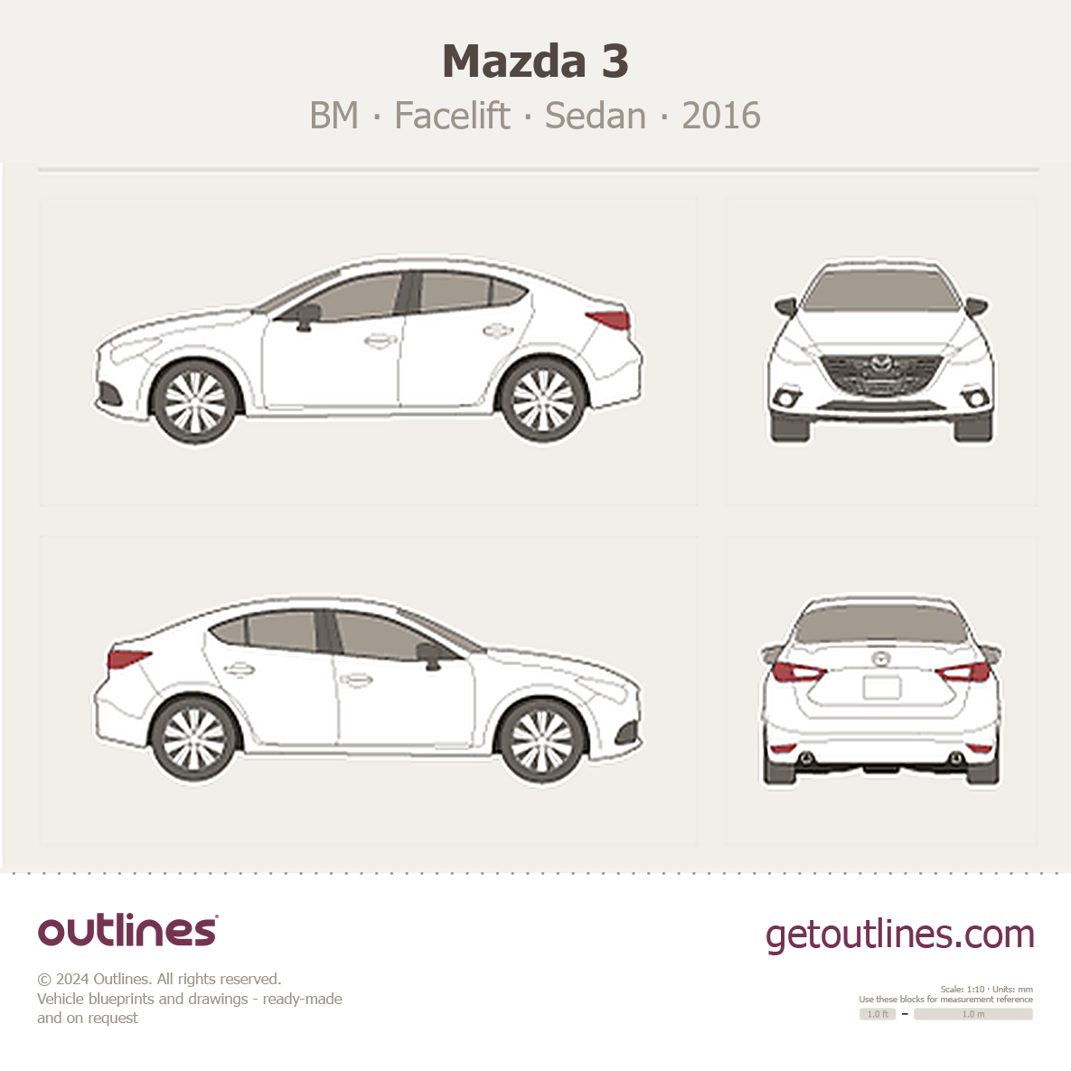 This is a blueprint of the 3, produced by carmaker Mazda in 2016 - Present (2025, 2026). It features a Sedan body design and is classified as a Family vehicle.