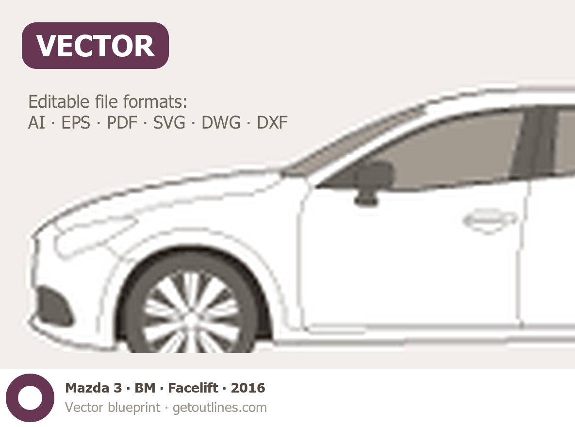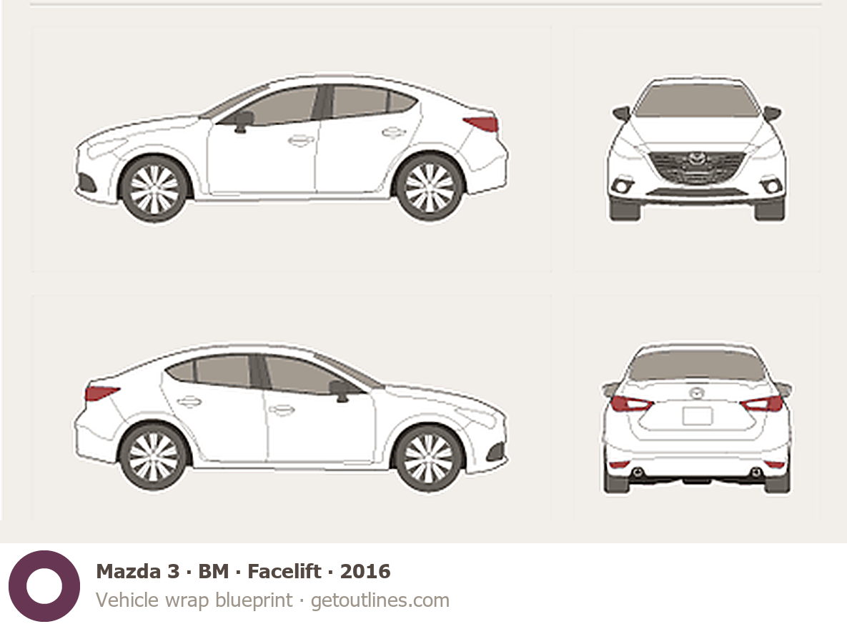 This 2016 Mazda 3 BM Facelift Sedan blueprint helps designers, wrap studios, and 3D artists simplify their workflow and save valuable time for creative work instead of routine tasks.