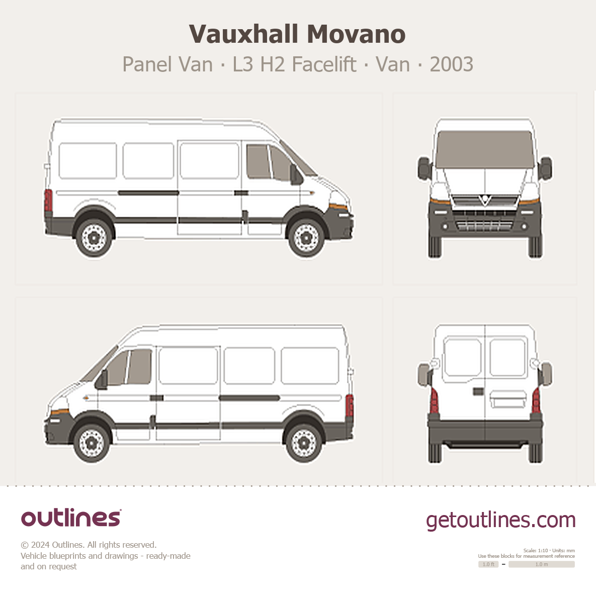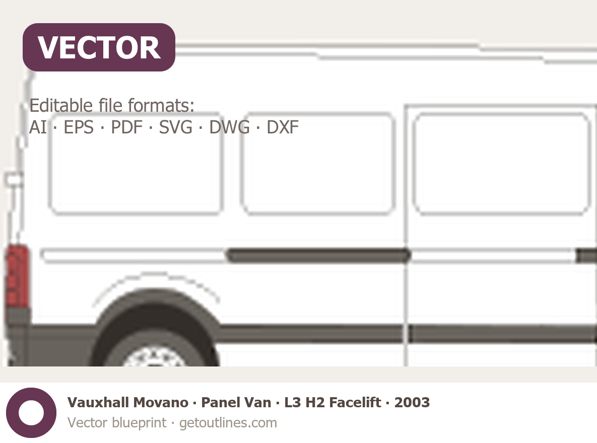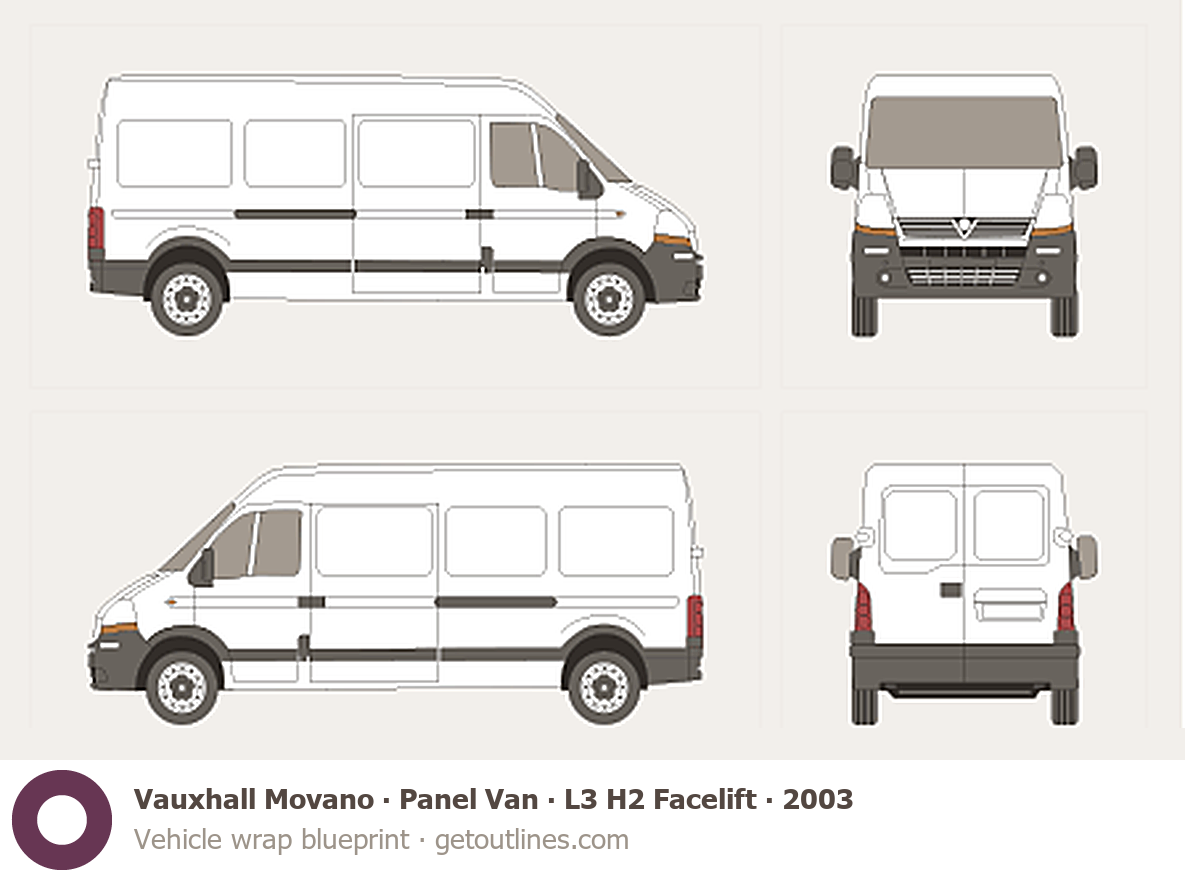 This 2003 Vauxhall Movano Panel Van L3 H2 Facelift Van blueprint helps designers, wrap studios, and 3D artists simplify their workflow and save valuable time for creative work instead of routine tasks.