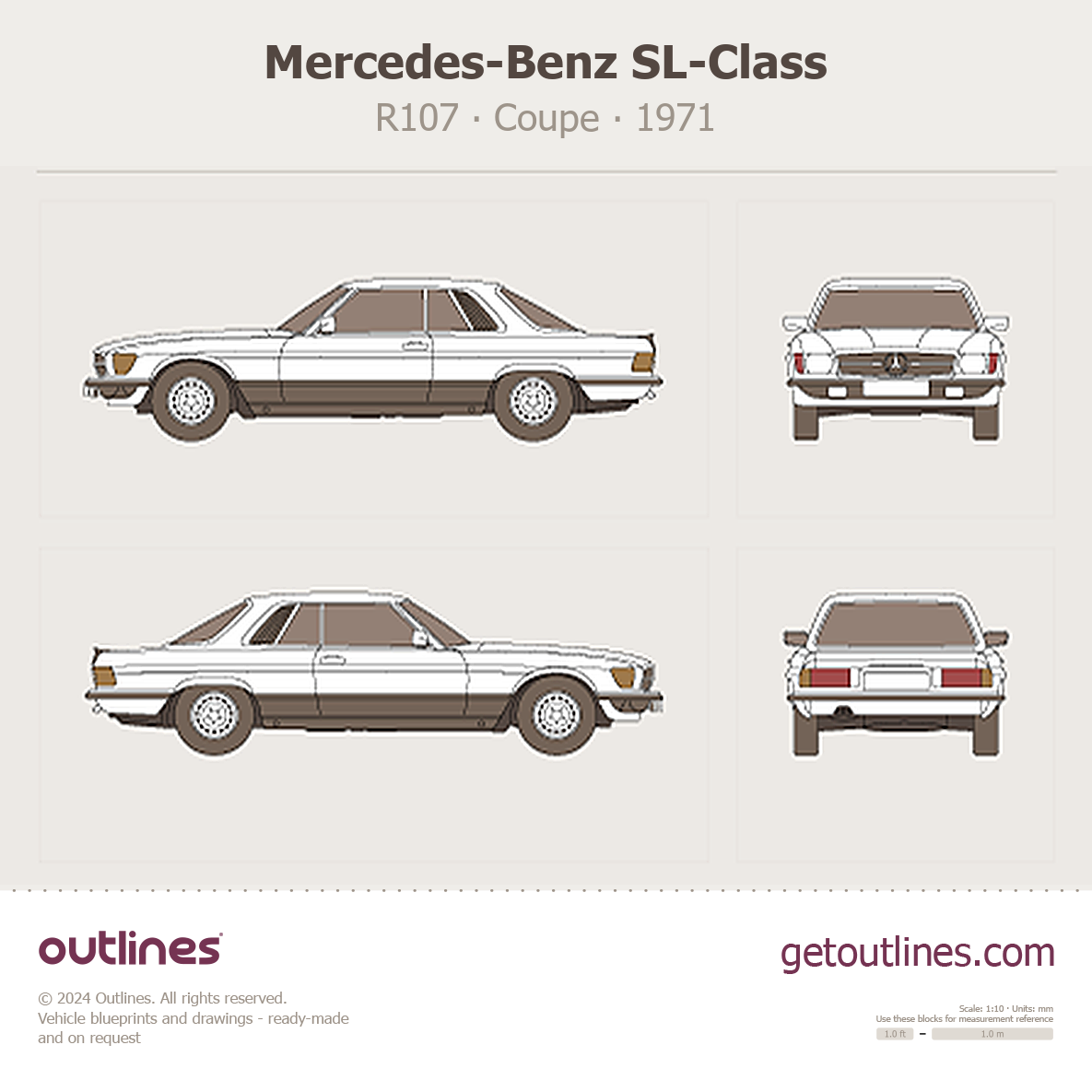 This is a blueprint of the SL-Class, produced by carmaker Mercedes-Benz in 1971 - 1989. It features a Coupe body design and is classified as a Luxury vehicle.