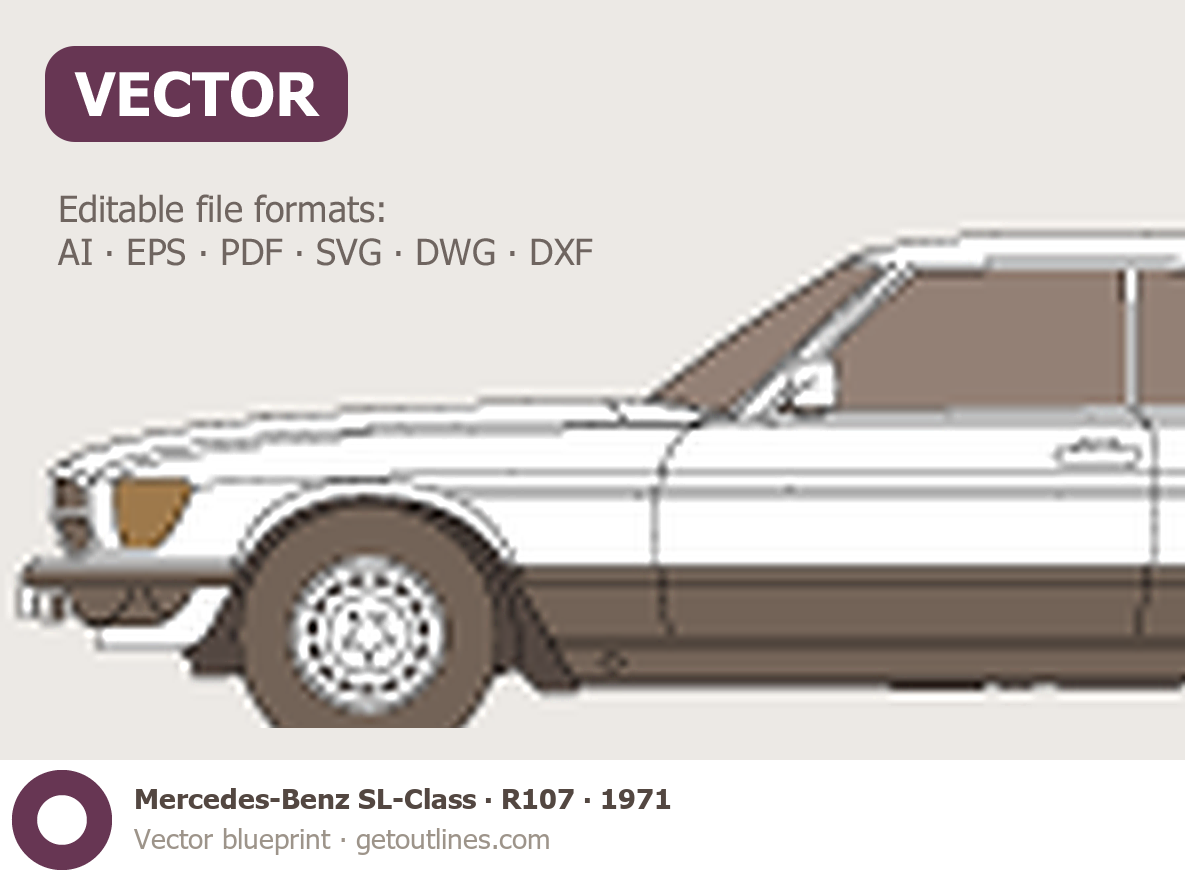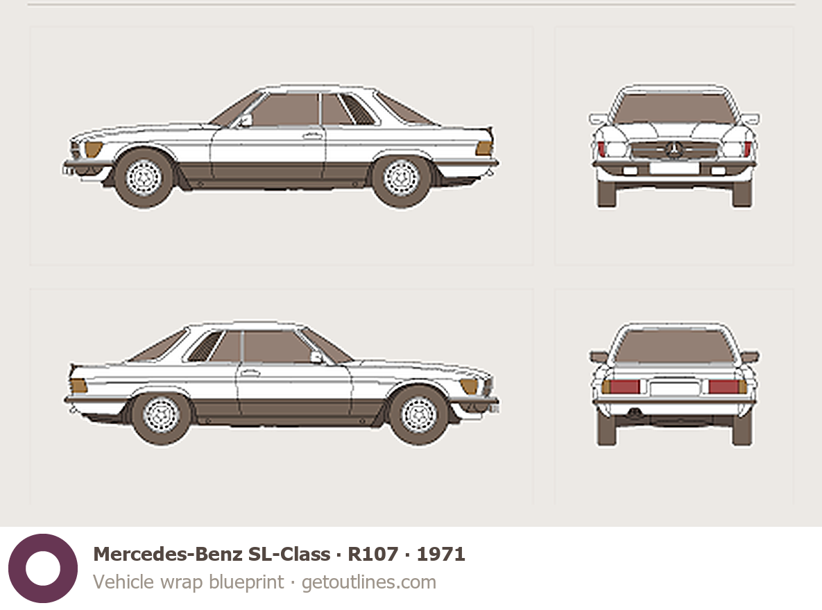 This 1971 Mercedes-Benz SL-Class R107 Coupe blueprint helps designers, wrap studios, and 3D artists simplify their workflow and save valuable time for creative work instead of routine tasks.
