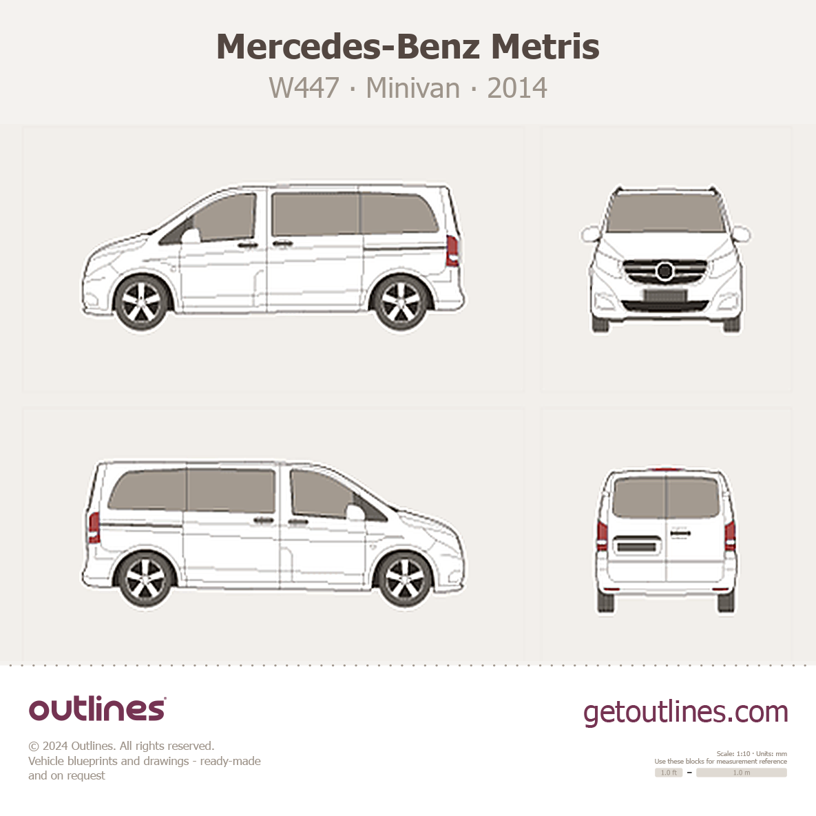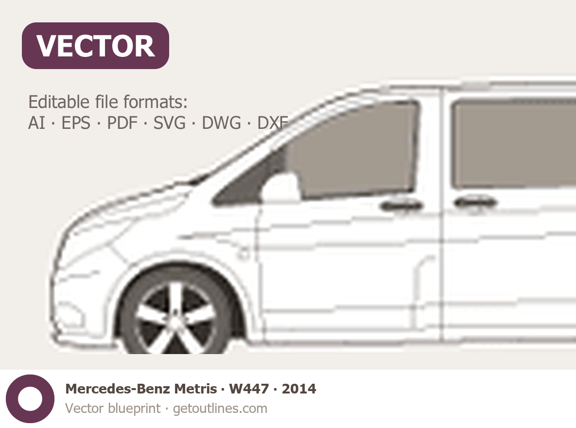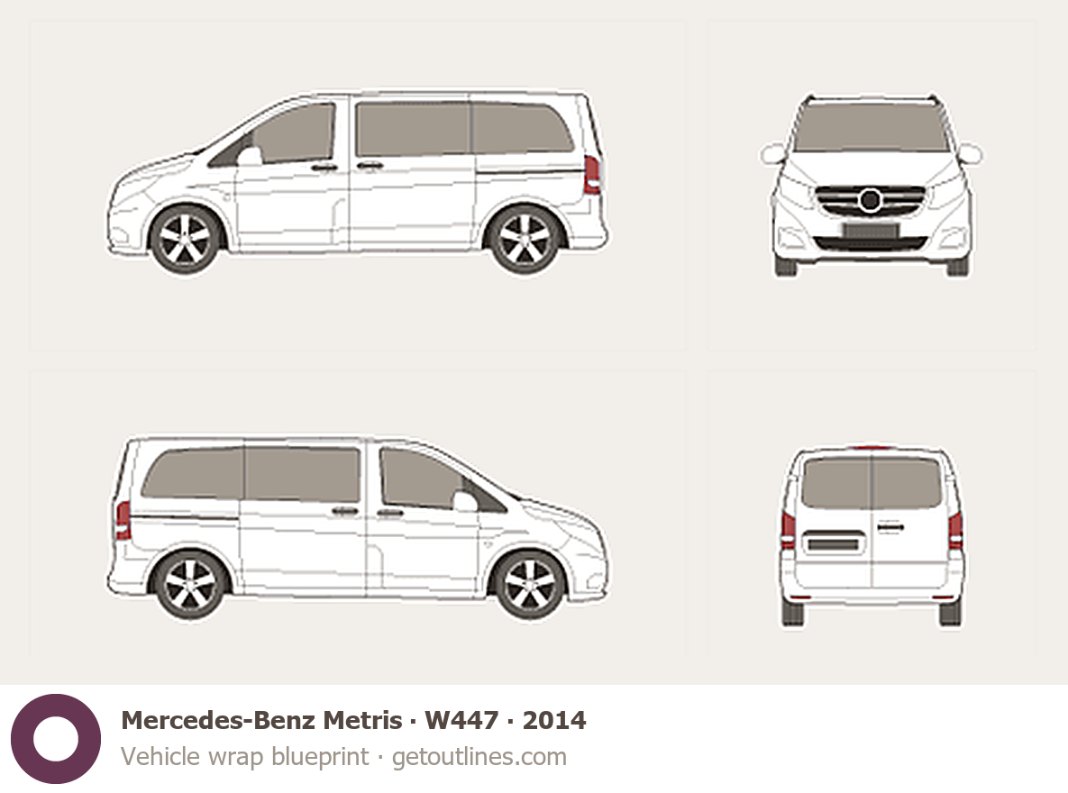 This 2014 Mercedes-Benz Metris W447 Minivan blueprint helps designers, wrap studios, and 3D artists simplify their workflow and save valuable time for creative work instead of routine tasks.