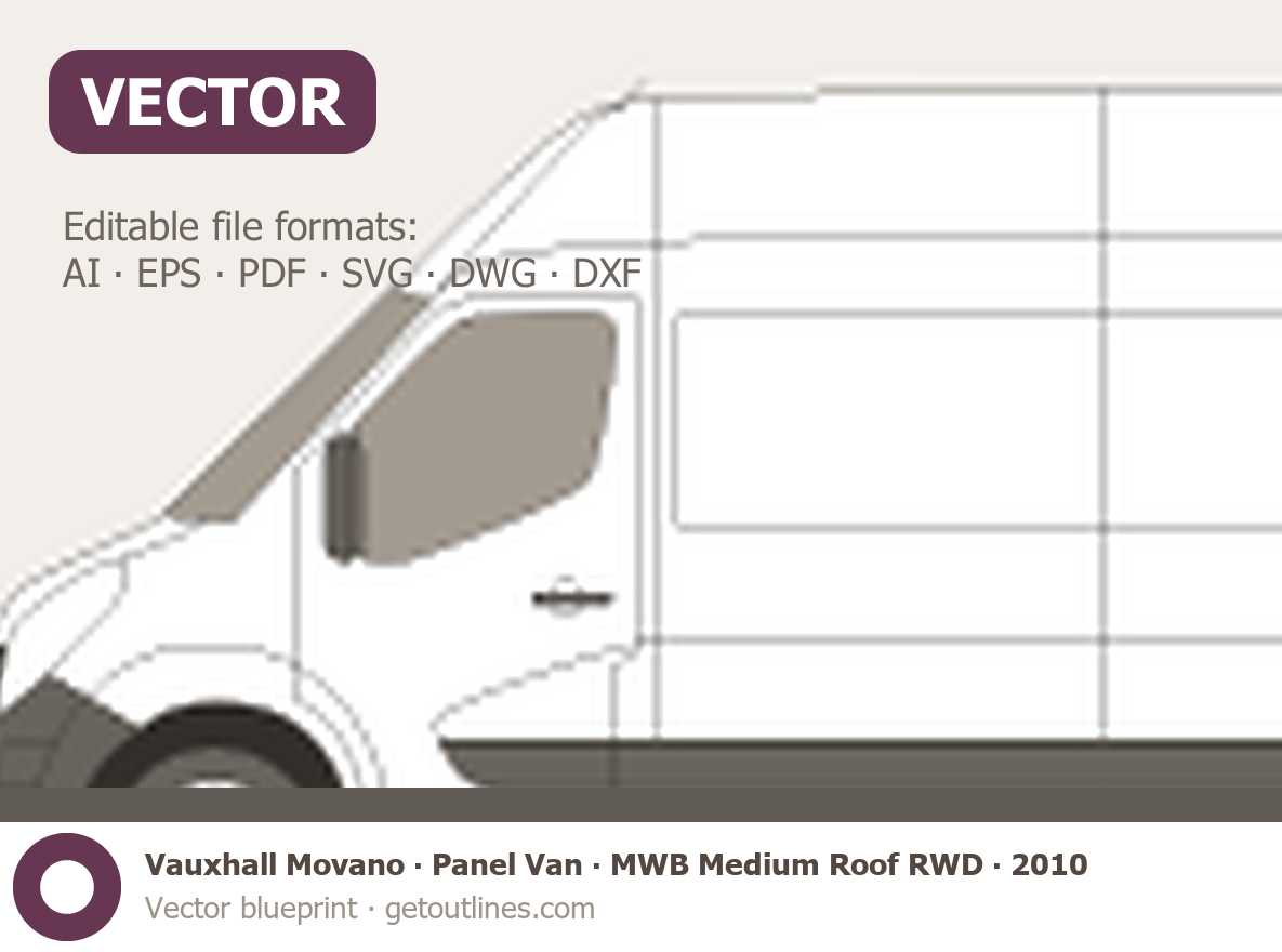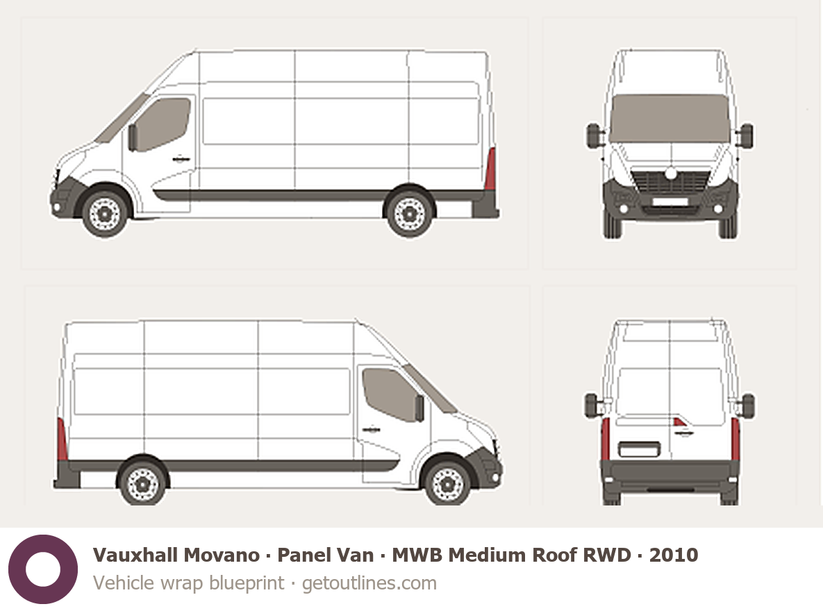 This 2010 Vauxhall Movano Panel Van MWB Medium Roof RWD Van blueprint helps designers, wrap studios, and 3D artists simplify their workflow and save valuable time for creative work instead of routine tasks.