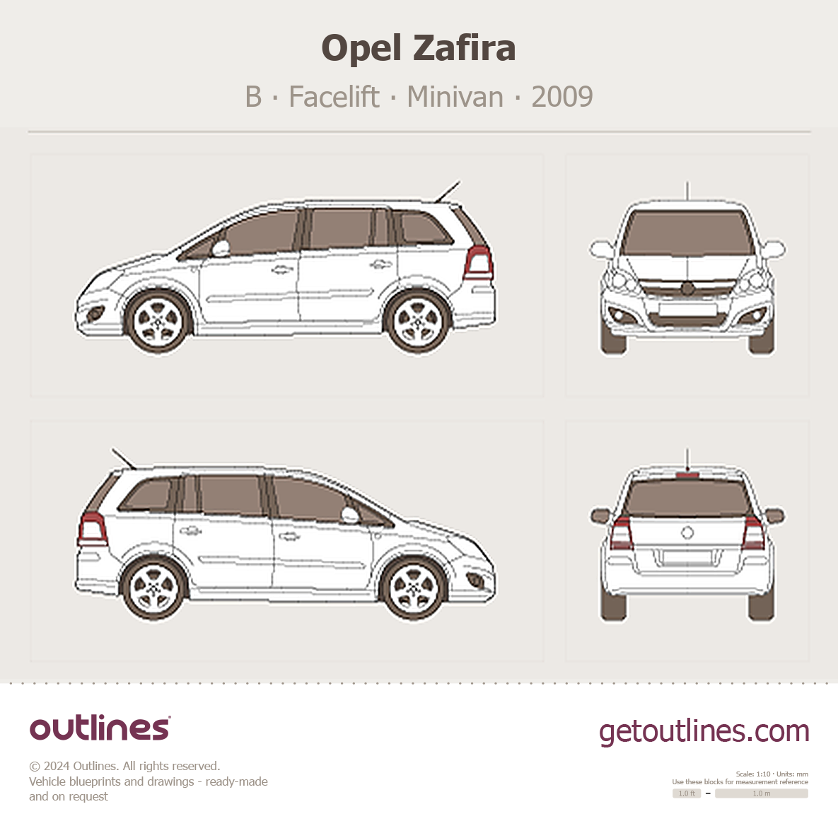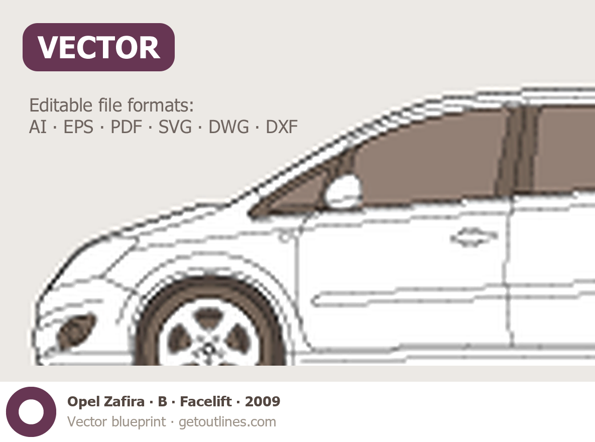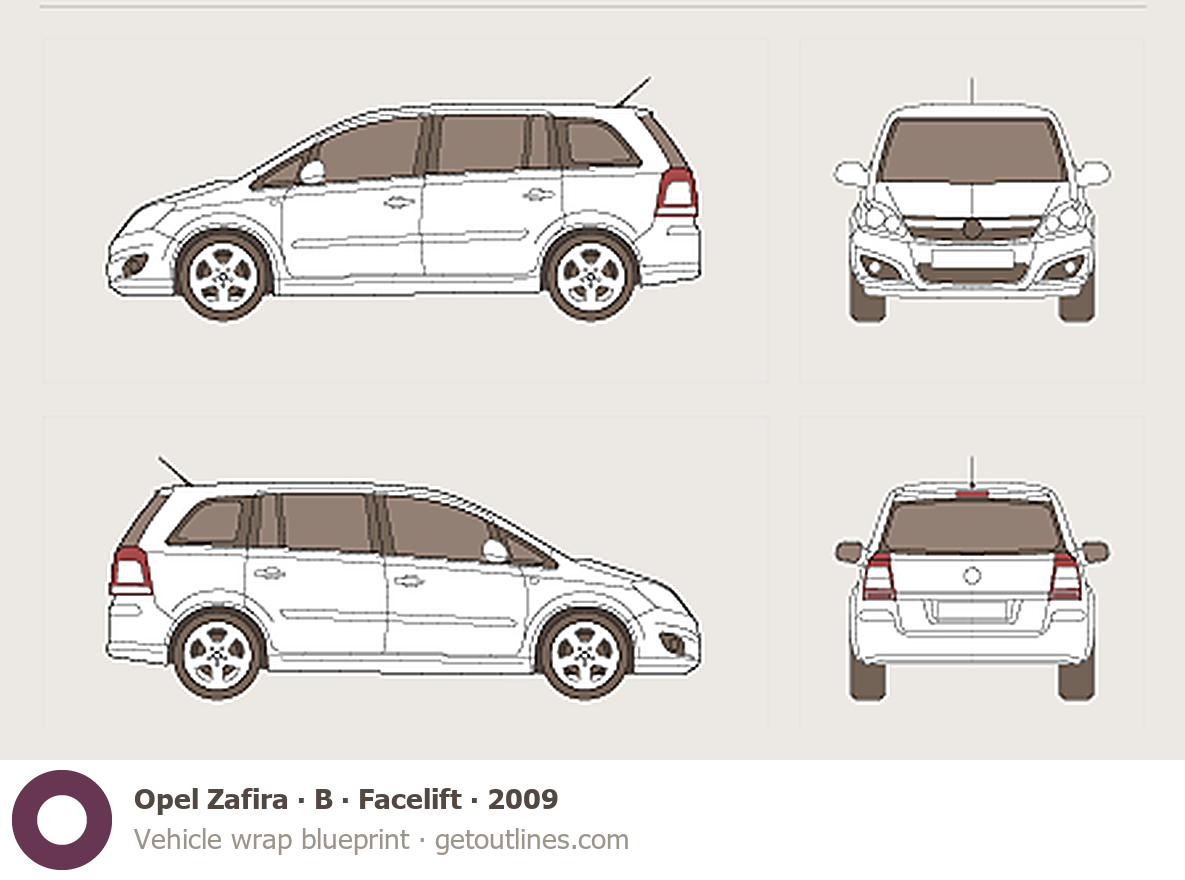 This 2009 Opel Zafira B Facelift Minivan blueprint helps designers, wrap studios, and 3D artists simplify their workflow and save valuable time for creative work instead of routine tasks.
