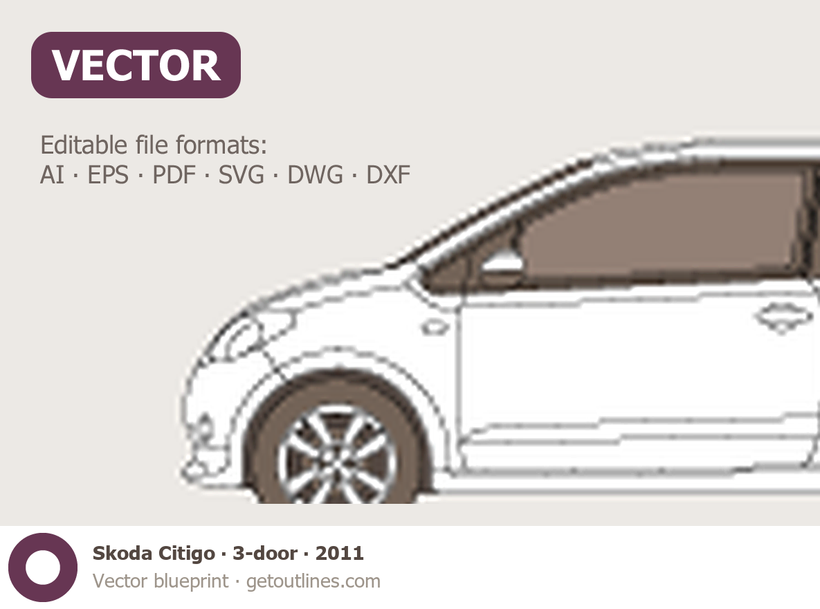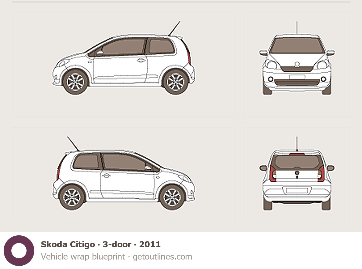This 2011 Skoda Citigo 3-door Hatchback blueprint helps designers, wrap studios, and 3D artists simplify their workflow and save valuable time for creative work instead of routine tasks.