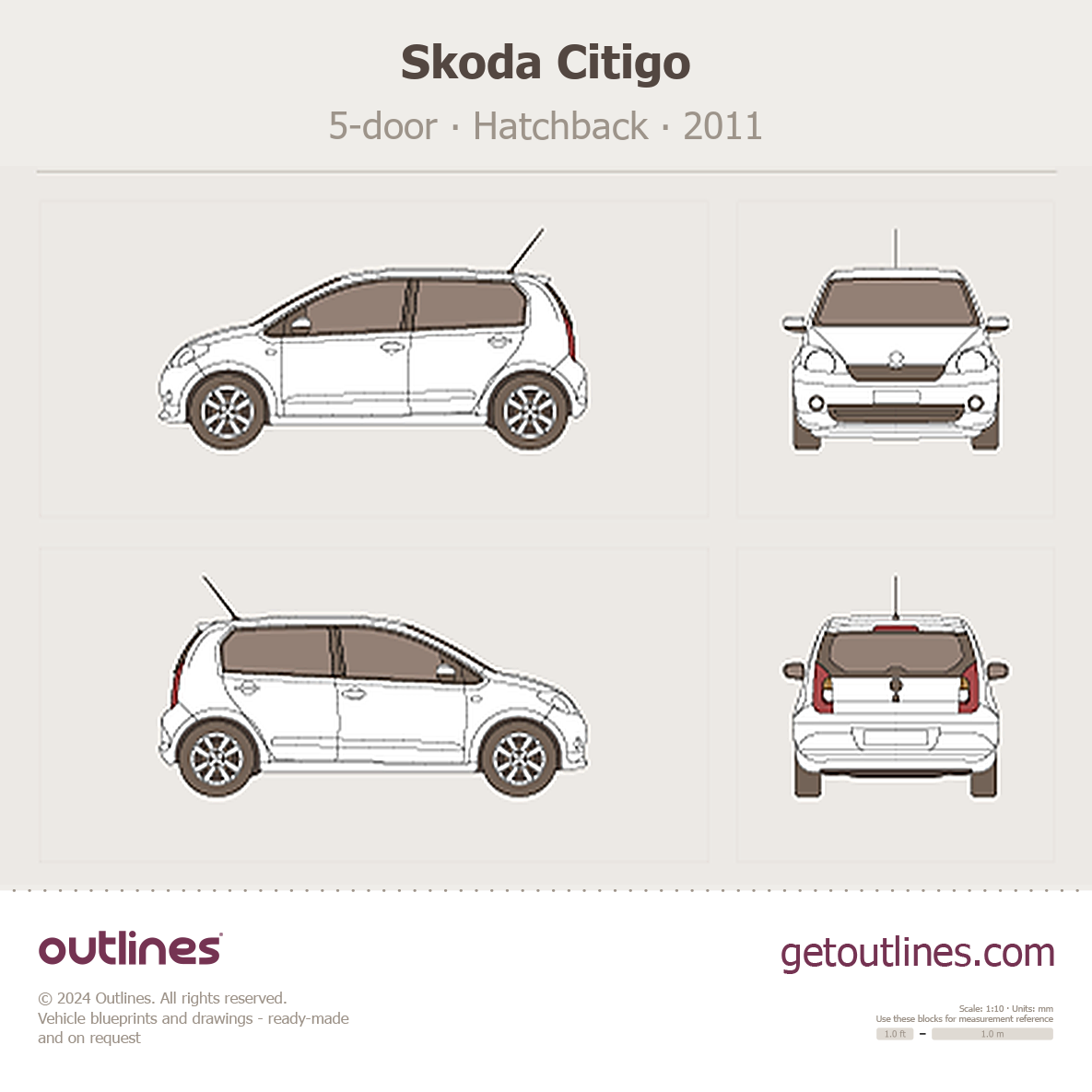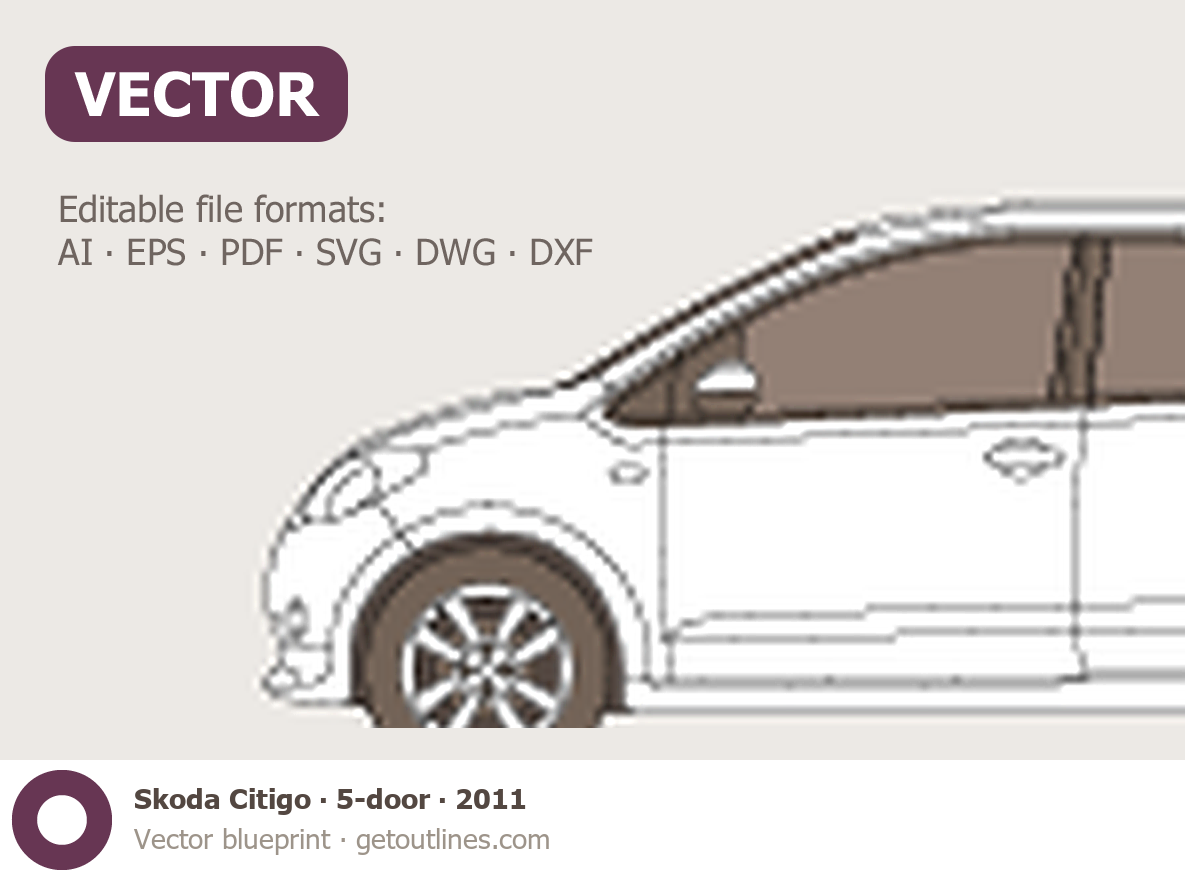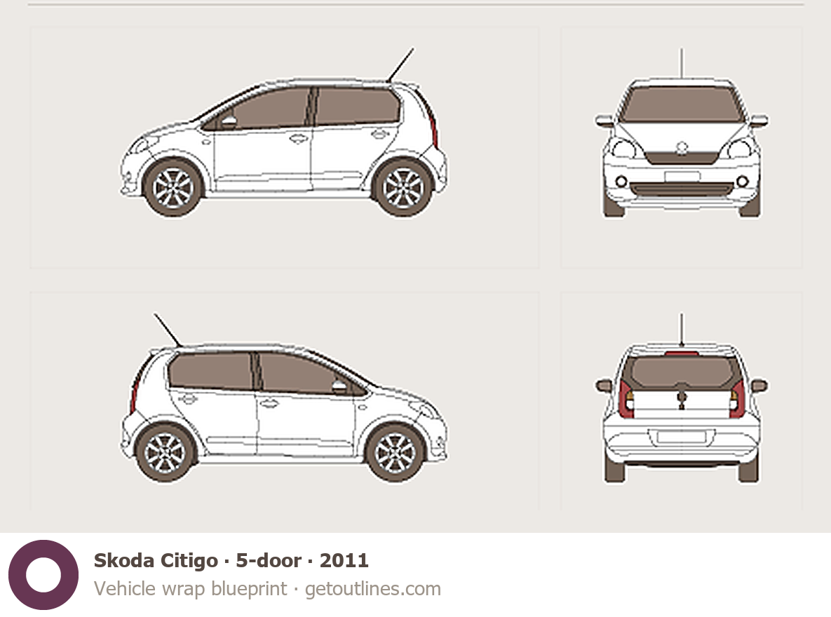 This 2011 Skoda Citigo 5-door Hatchback blueprint helps designers, wrap studios, and 3D artists simplify their workflow and save valuable time for creative work instead of routine tasks.