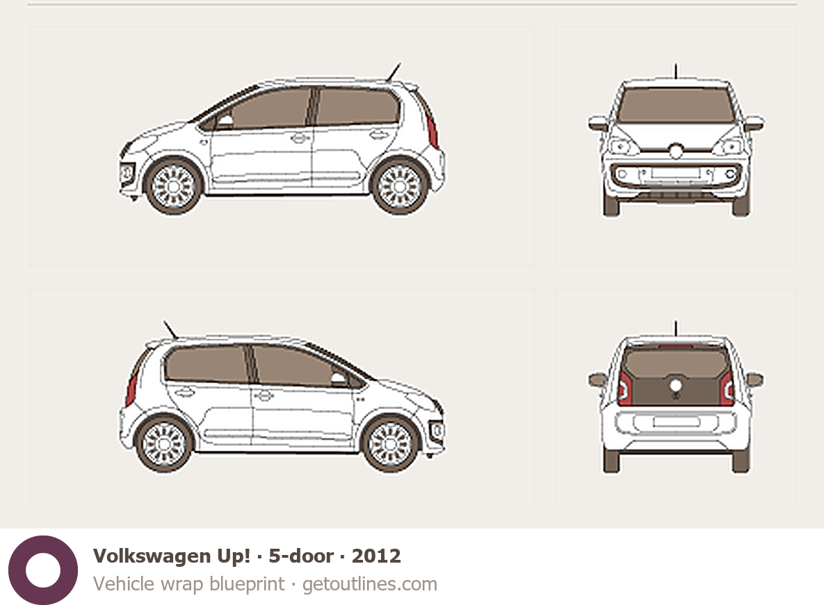 This 2012 Volkswagen Up! 5-door Hatchback blueprint helps designers, wrap studios, and 3D artists simplify their workflow and save valuable time for creative work instead of routine tasks.