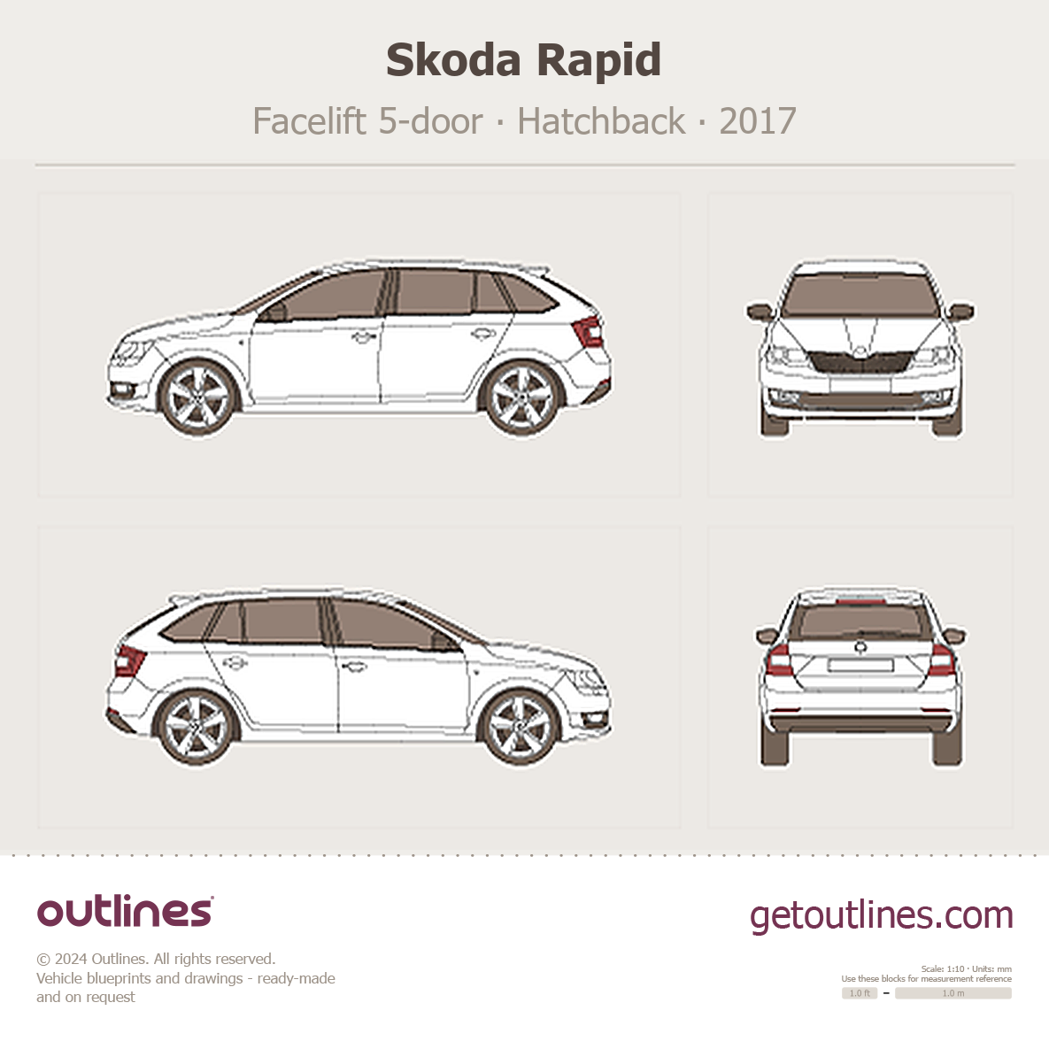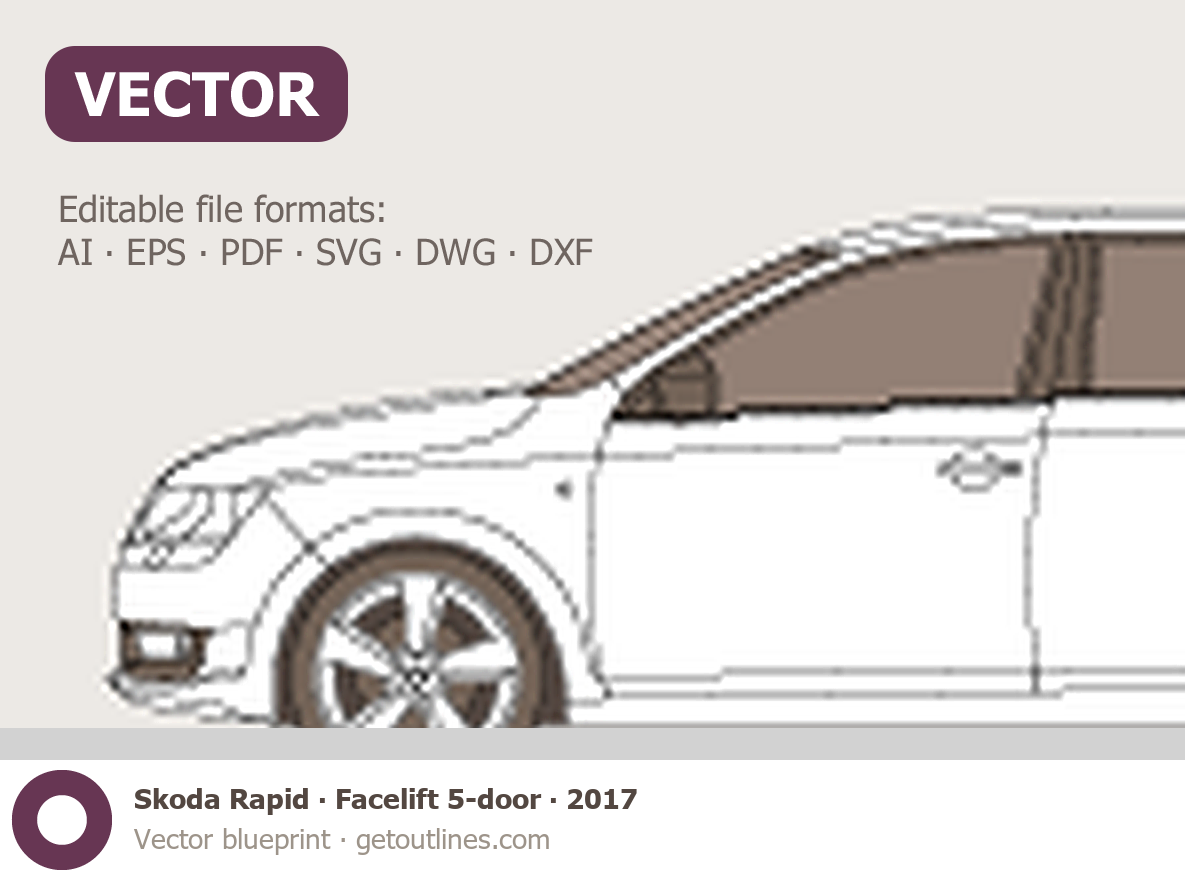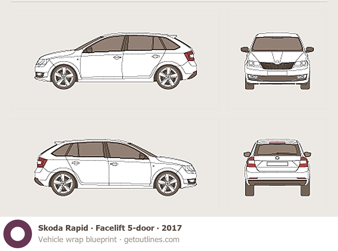 This 2017 Skoda Rapid Facelift 5-door Hatchback blueprint helps designers, wrap studios, and 3D artists simplify their workflow and save valuable time for creative work instead of routine tasks.