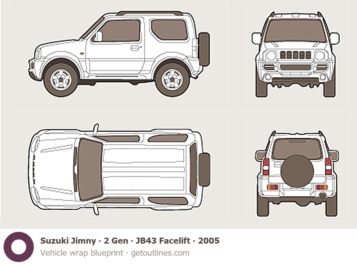 This 2005 Suzuki Jimny 2 Gen ∙ JB43 Facelift SUV blueprint helps designers, wrap studios, and 3D artists simplify their workflow and save valuable time for creative work instead of routine tasks.
