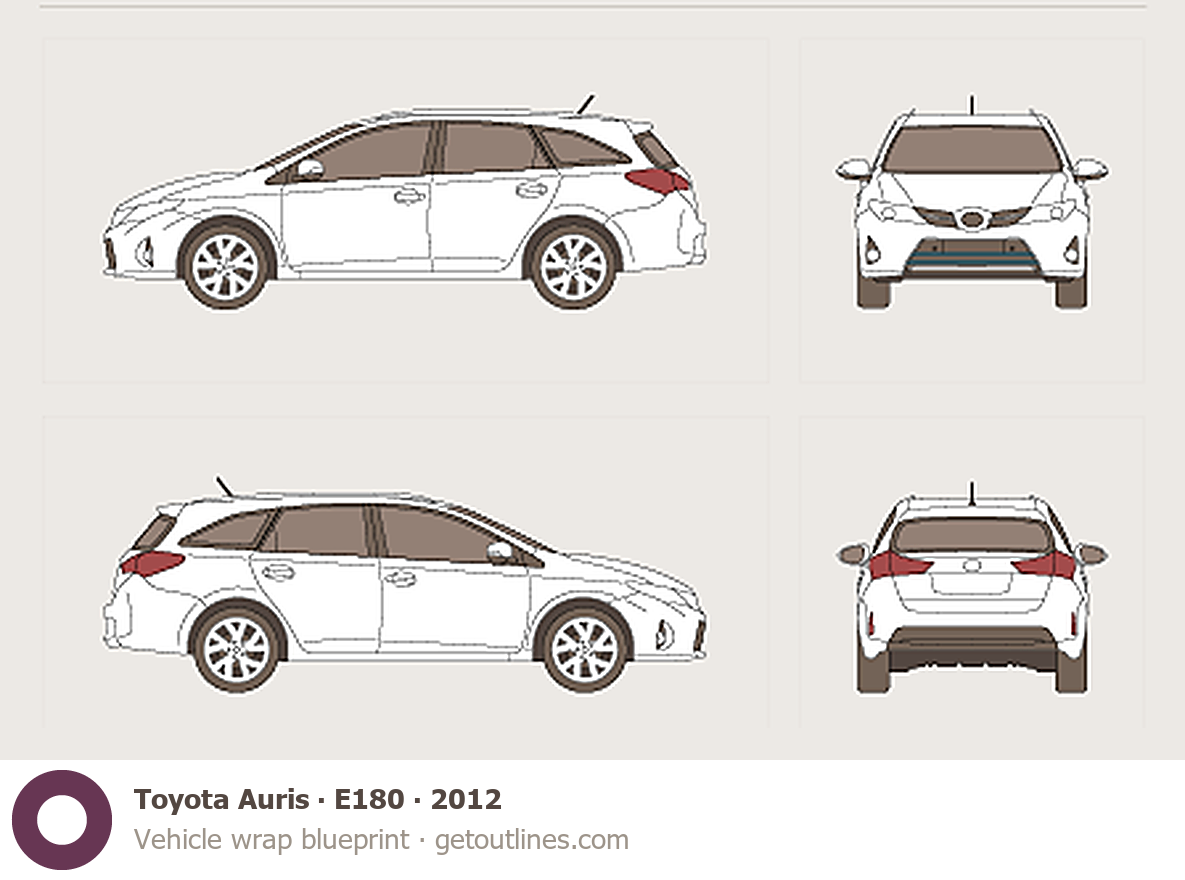 This 2012 Toyota Auris E180 Wagon blueprint helps designers, wrap studios, and 3D artists simplify their workflow and save valuable time for creative work instead of routine tasks.