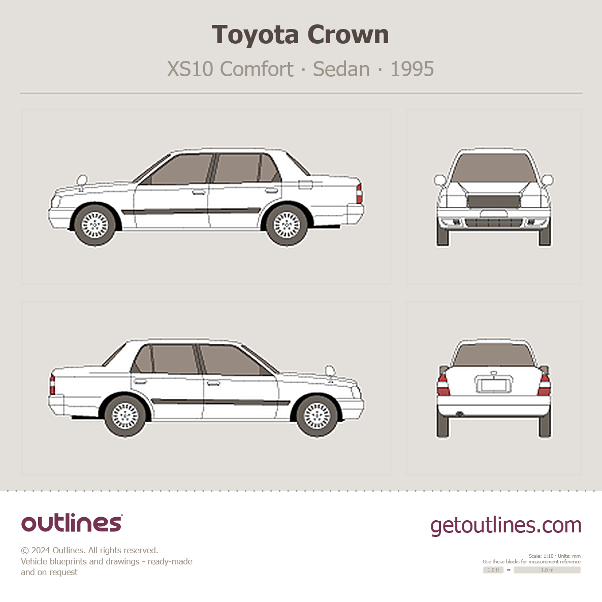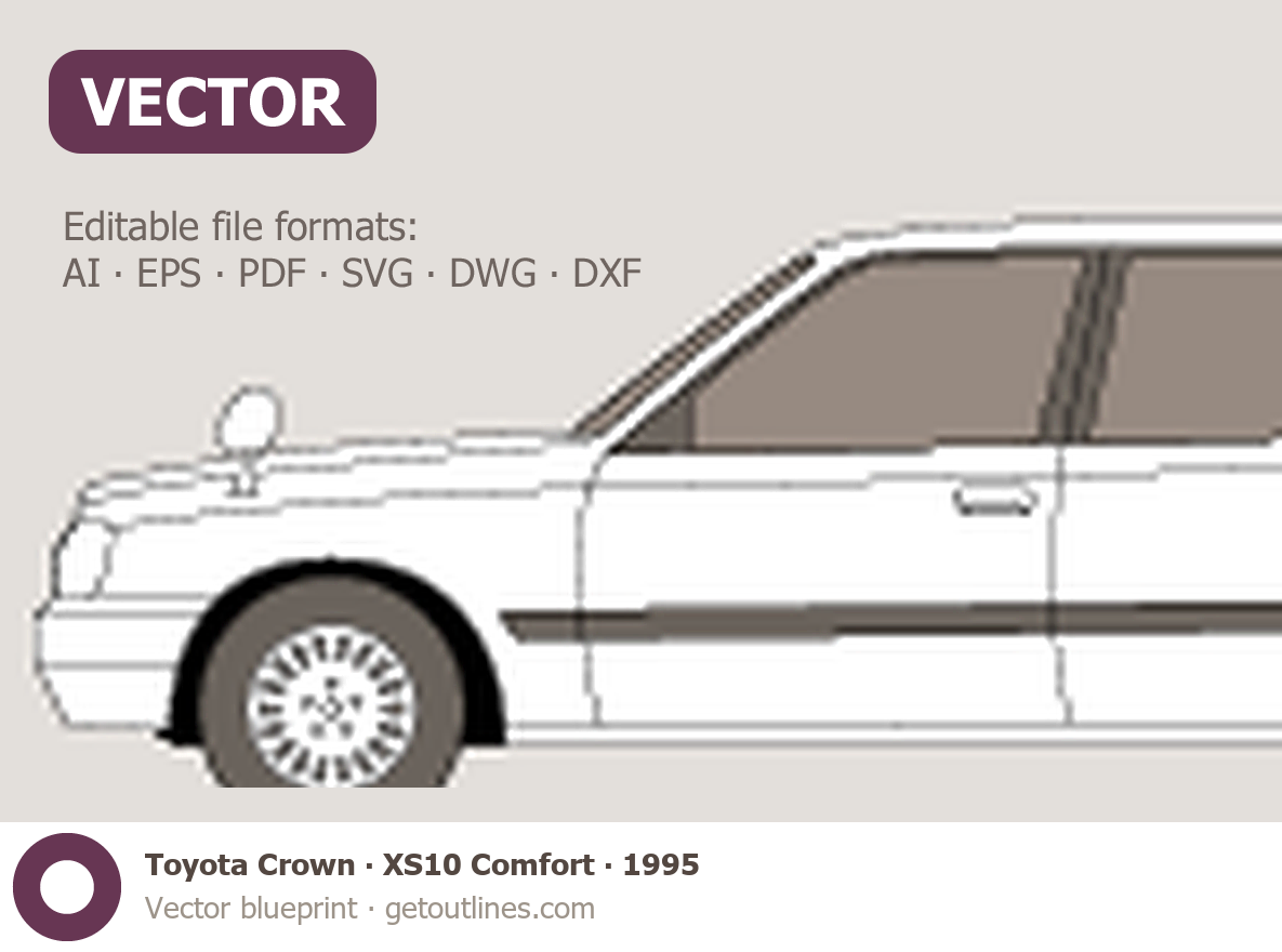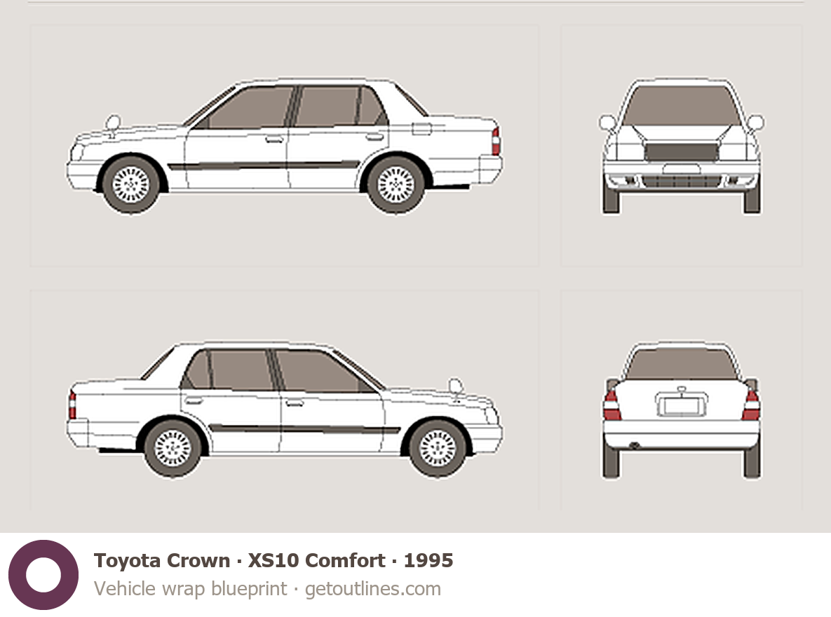 This 1995 Toyota Crown XS10 Comfort Sedan blueprint helps designers, wrap studios, and 3D artists simplify their workflow and save valuable time for creative work instead of routine tasks.