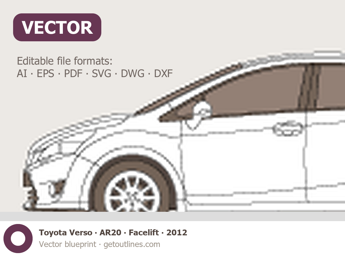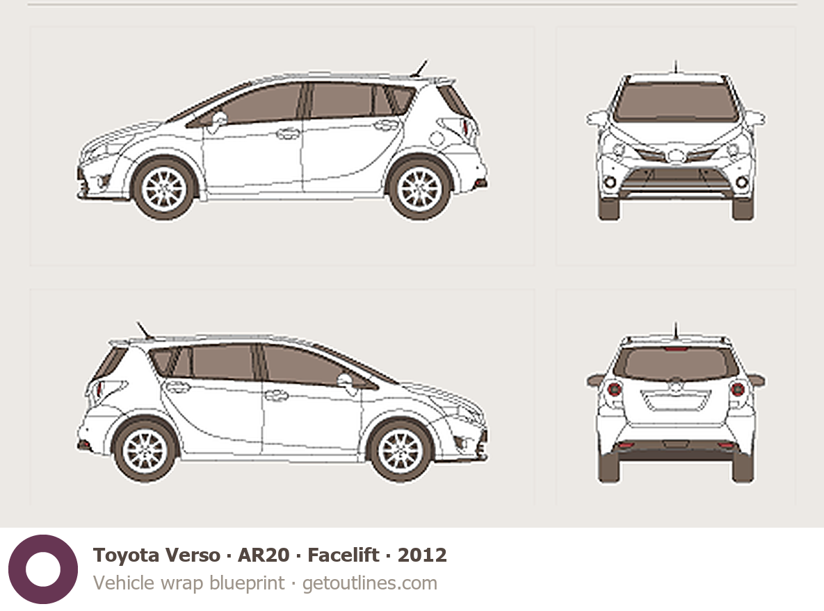 This 2012 Toyota Verso AR20 Facelift Minivan blueprint helps designers, wrap studios, and 3D artists simplify their workflow and save valuable time for creative work instead of routine tasks.