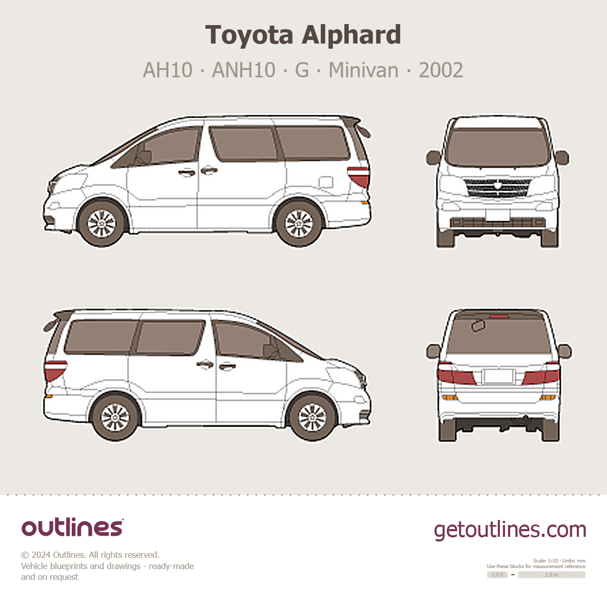 This 2002 Toyota Alphard AH10 ∙ ANH10 ∙ G Minivan blueprint helps designers, wrap studios, and 3D artists simplify their workflow and save valuable time for creative work instead of routine tasks.