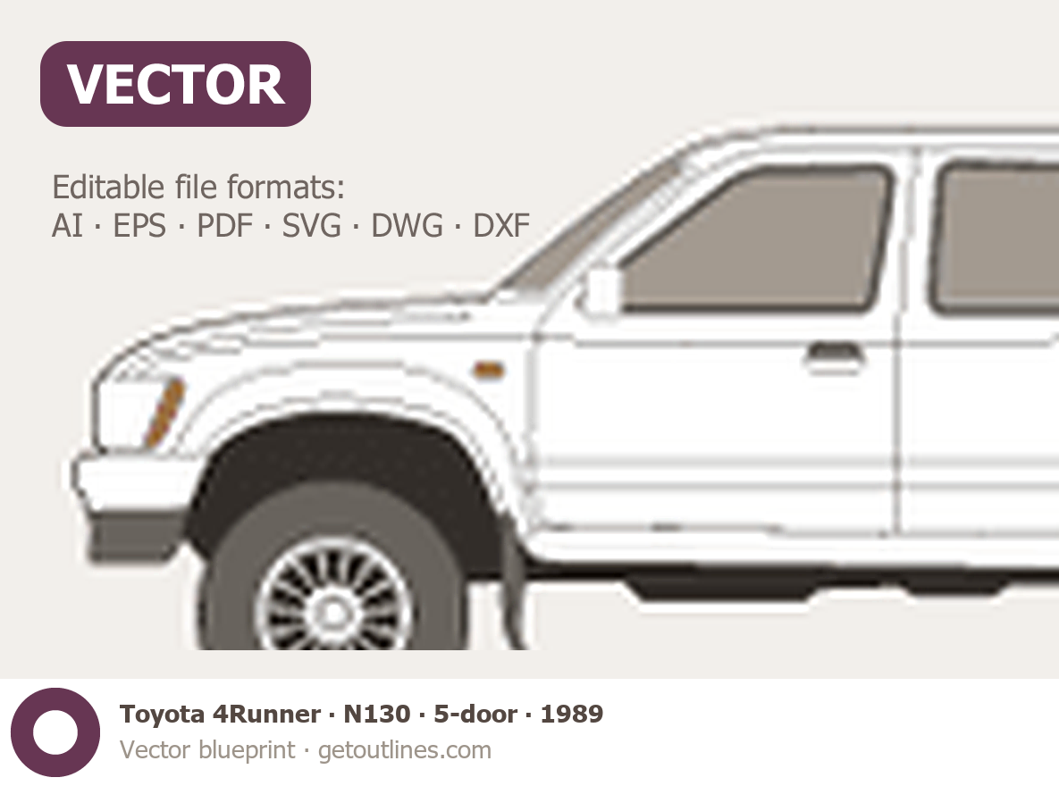 This 1989 Toyota 4Runner N130 5-door SUV blueprint helps designers, wrap studios, and 3D artists simplify their workflow and save valuable time for creative work instead of routine tasks.