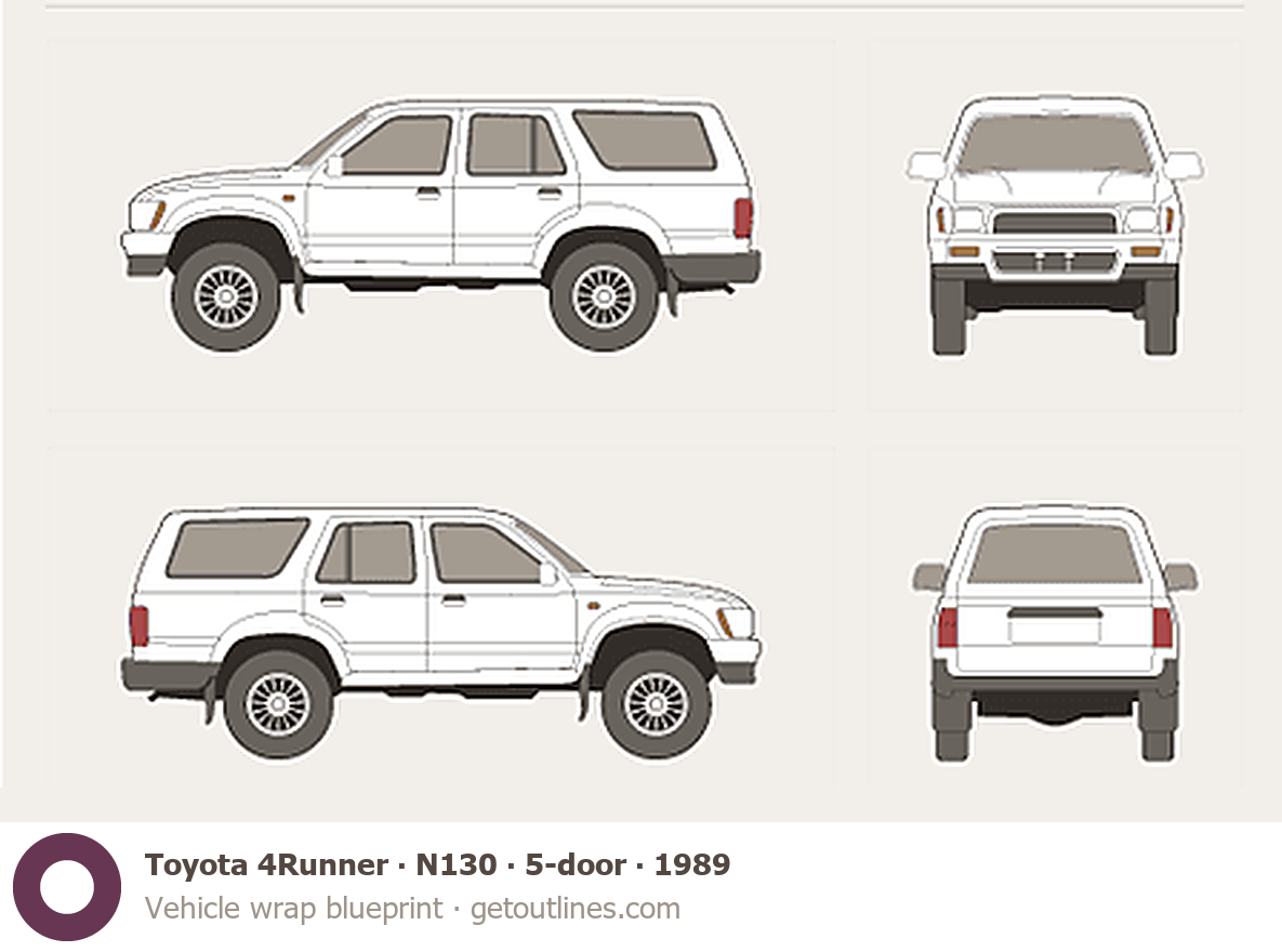 This template is suitable for Toyota 4Runner models from 1989 to 1995, including 1989, 1990, 1991, 1992, and 1995 model years, and is commonly used for vehicle wrap and signage design.
