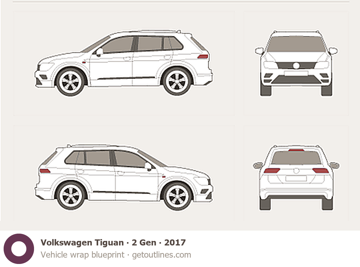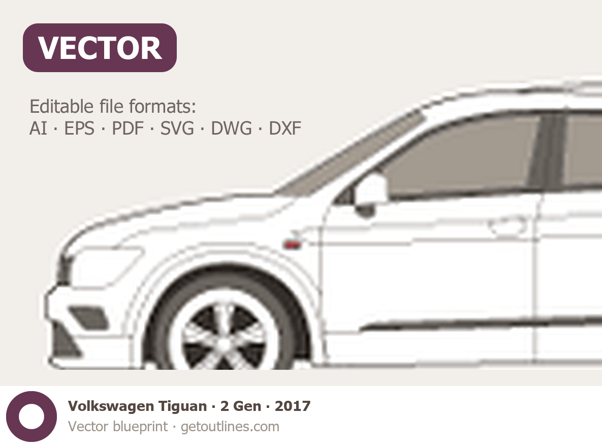 Buy this Volkswagen Tiguan 2 Gen blueprint and line drawing in high-quality editable vector file formats. Best for 3D and car wrap design.