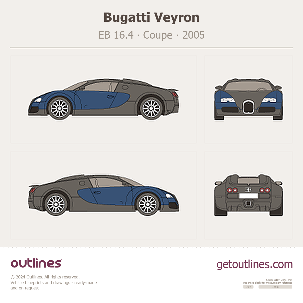 This is a blueprint of the Veyron, produced by carmaker Bugatti in 2005 - 2015. It features a Coupe body design and is classified as a Supercar vehicle.