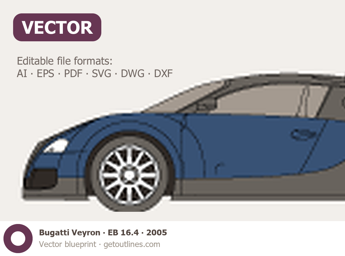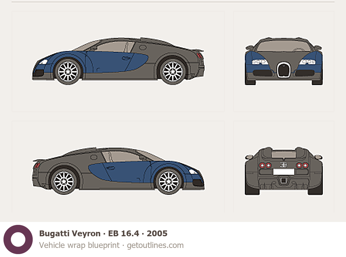 This 2005 Bugatti Veyron EB 16.4 Coupe blueprint helps designers, wrap studios, and 3D artists simplify their workflow and save valuable time for creative work instead of routine tasks.