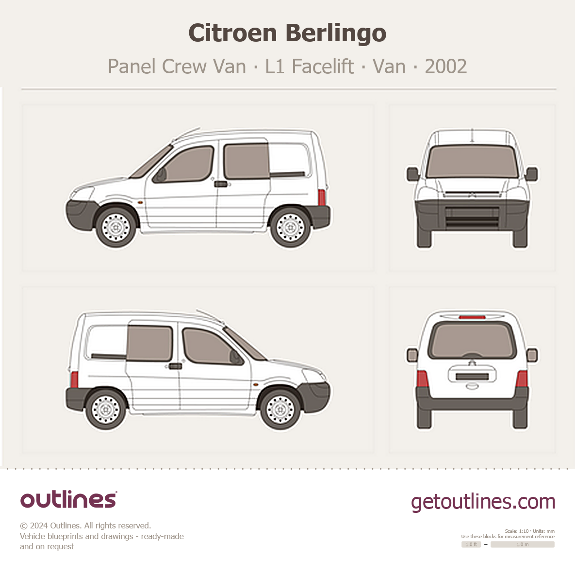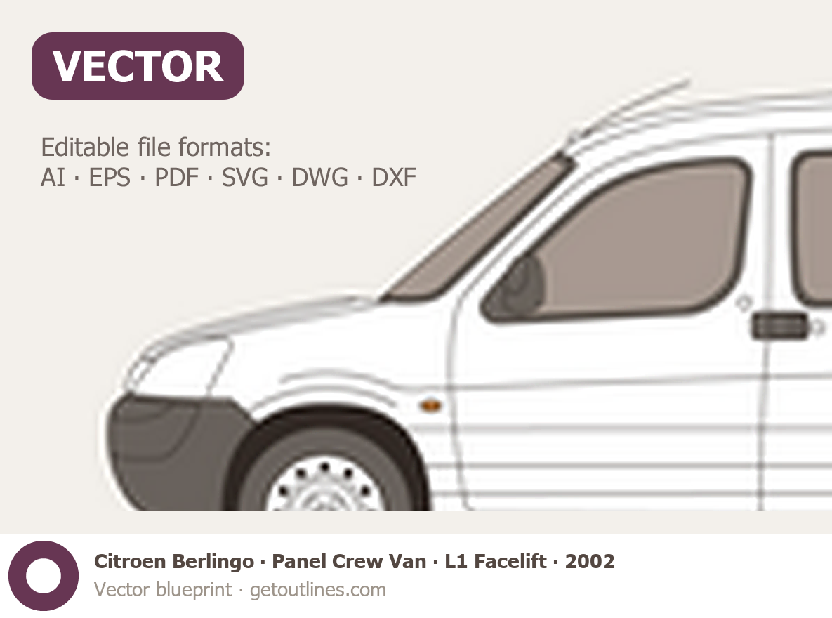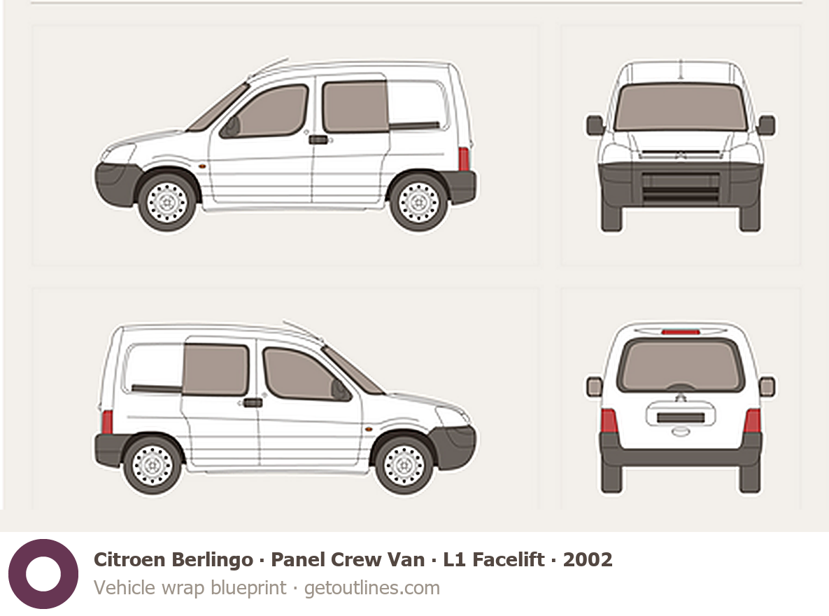 This 2002 Citroen Berlingo Panel Crew Van L1 Facelift Van blueprint helps designers, wrap studios, and 3D artists simplify their workflow and save valuable time for creative work instead of routine tasks.