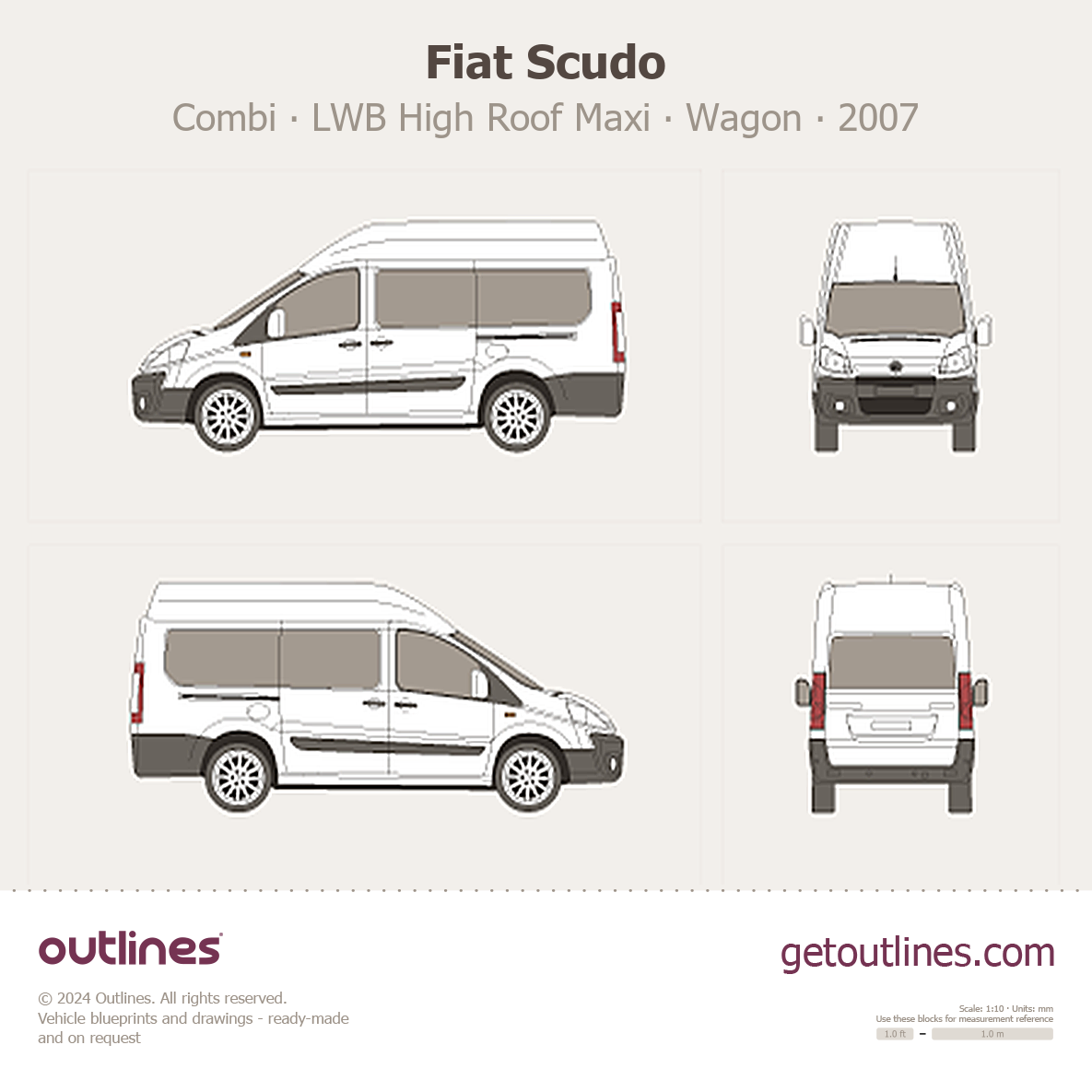 This 2007 Fiat Scudo Combi LWB High Roof Maxi Wagon blueprint helps designers, wrap studios, and 3D artists simplify their workflow and save valuable time for creative work instead of routine tasks.